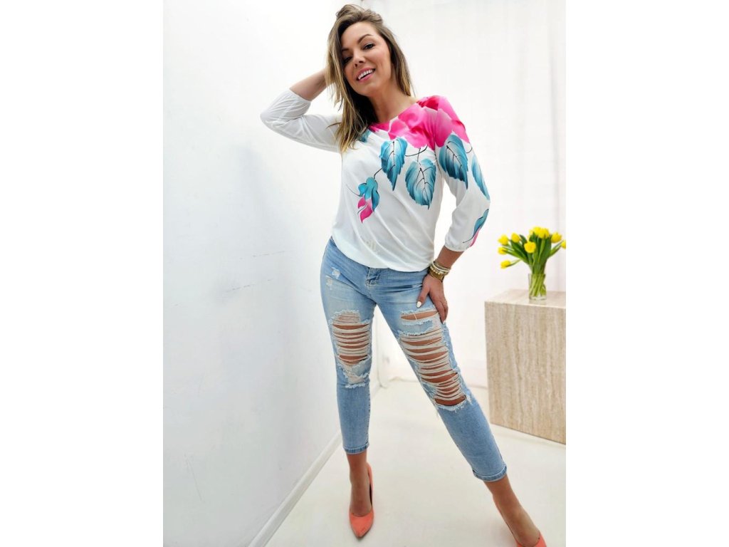 Dámska biela blúzka s dlhým rukávom a farebným kvetinovým vzorom 19727
