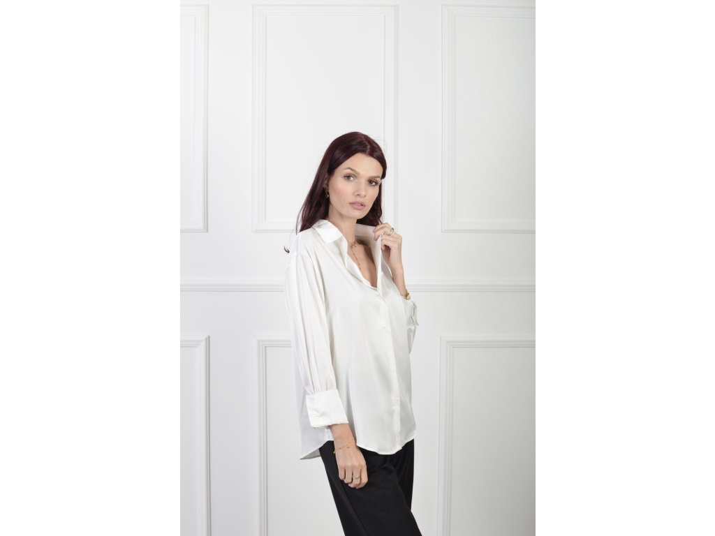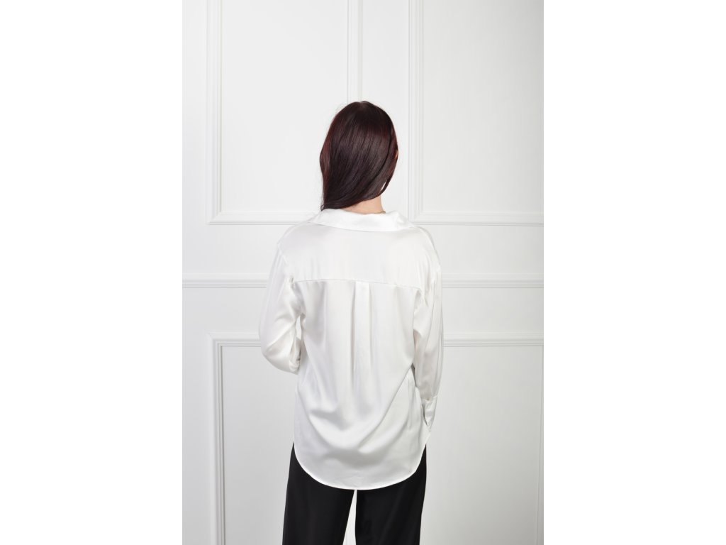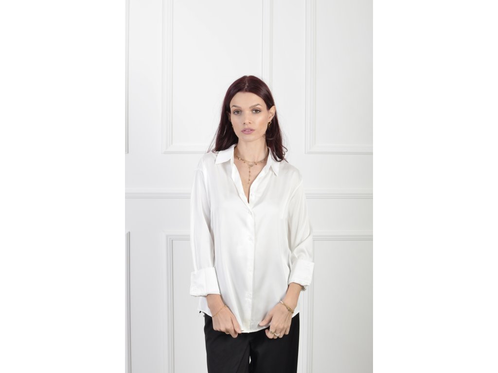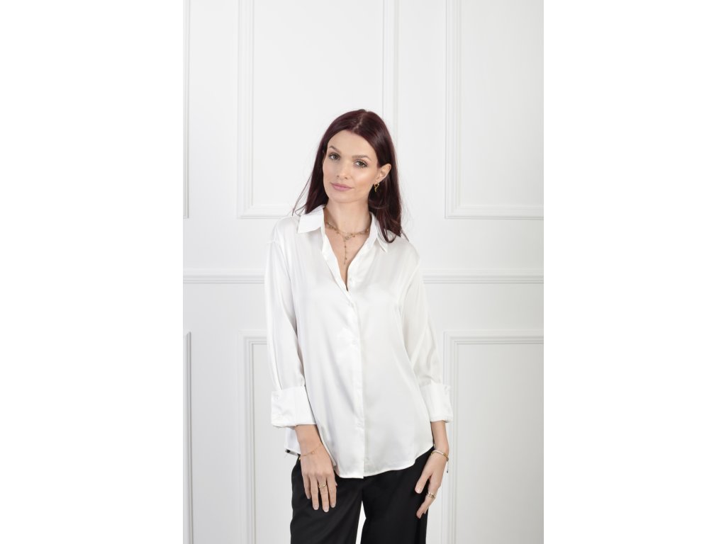 Dámska biela saténová košeľa s dlhým rukávom a zapínaním na gombíky.