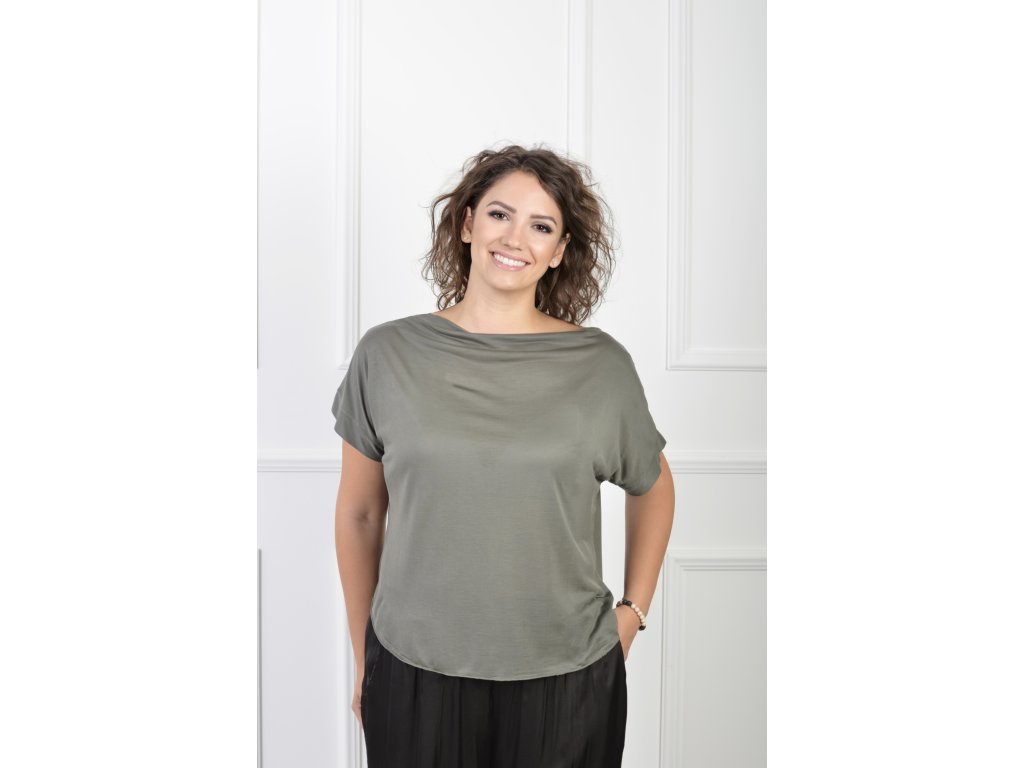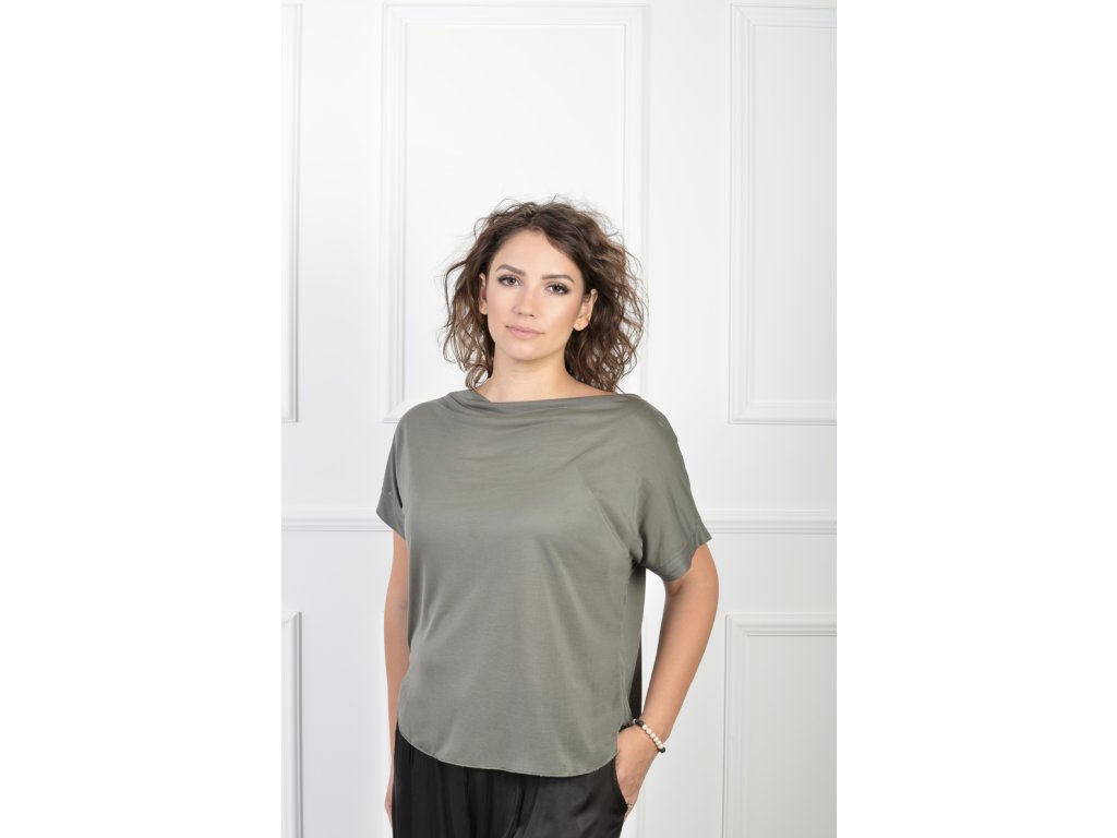 Dámska tmavozelená blúzka s rozšíreným výstrihom a krátkym rukávom.