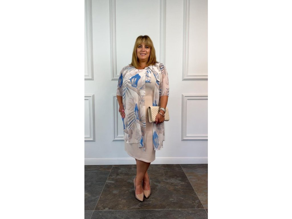Dámske béžovo-modré krátke šaty so vzorom a mušelínom 22234