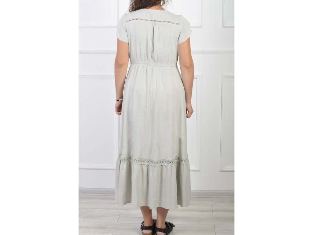 Dámske dlhé šaty bledozelenej farby s krátkym rukávom. Šaty majú vzorku na spodnej časti, zapínanie na gombíky a vrecká. Príjemný vzdušný letný kúsok.