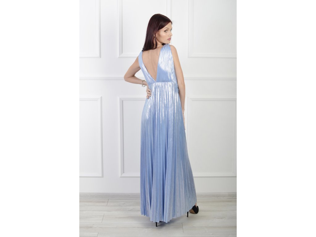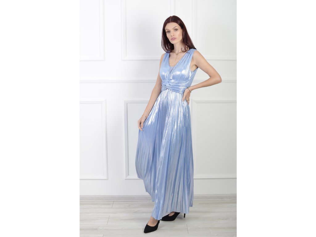 Dámske dlhé lesklé plisované šaty bledomodrej farby 22329