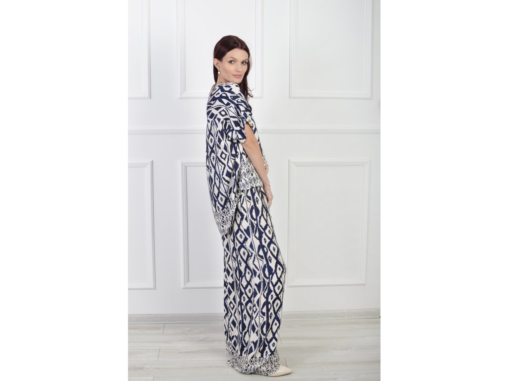 Dámske dlhé široké nohavice maslovej farby s tmavomodrým vzorom 21946