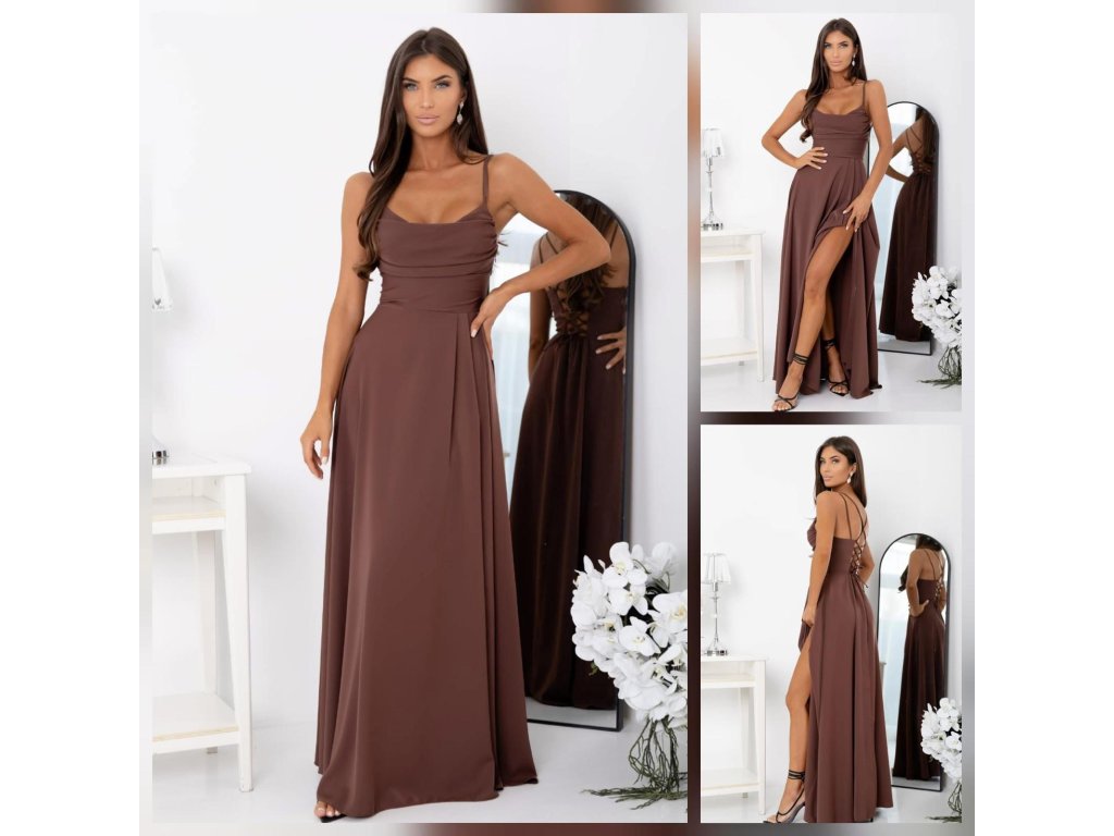 Dámske dlhé šaty hnedej čokoládovej farby na ramienka a s rozparkom. Šaty sú zúžené v páse a majú viazanie na chrbte. Elegantný kúsok na akúkoľvek spoločenskú udalosť.