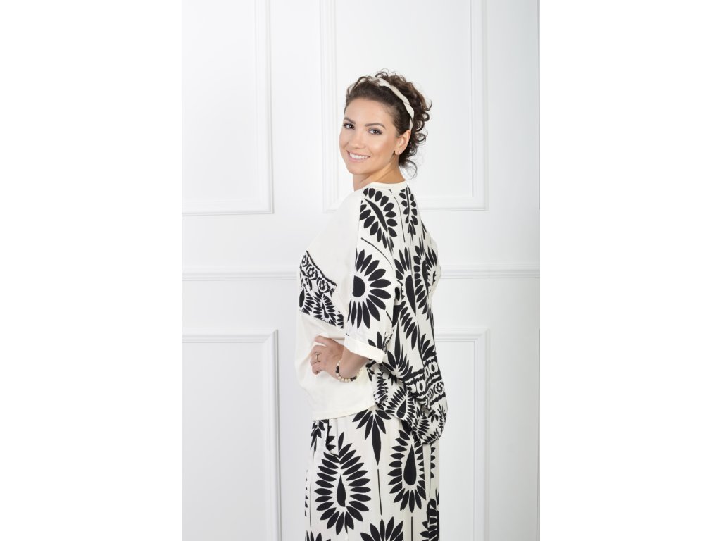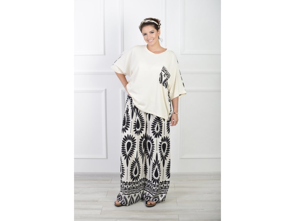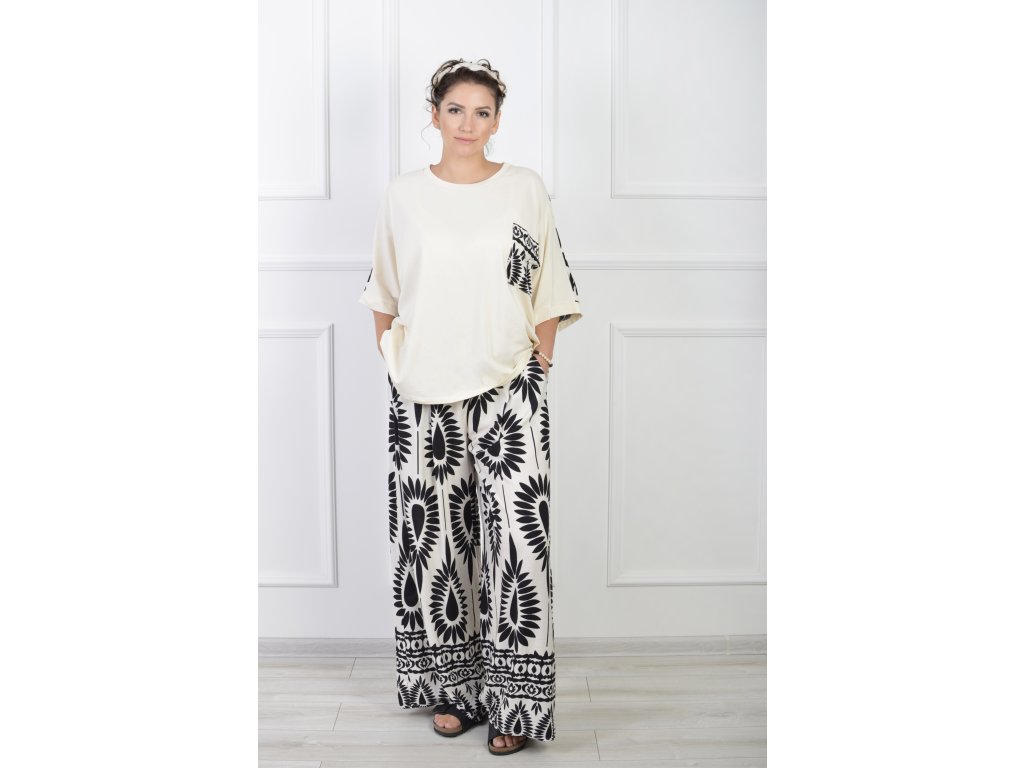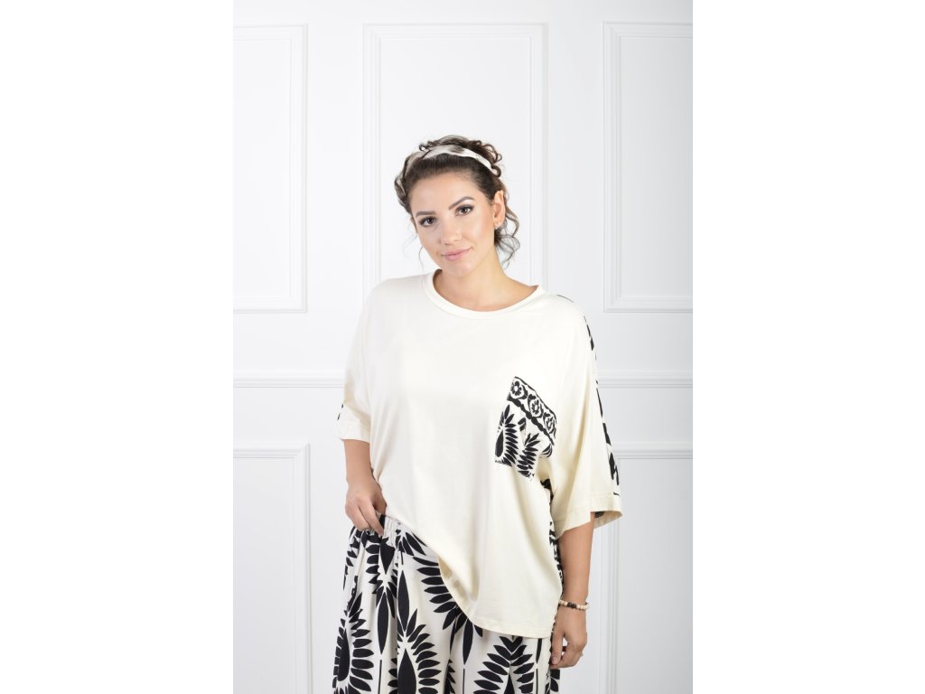 Dámske krémové oversize tričko s čiernym vzorom 21965
