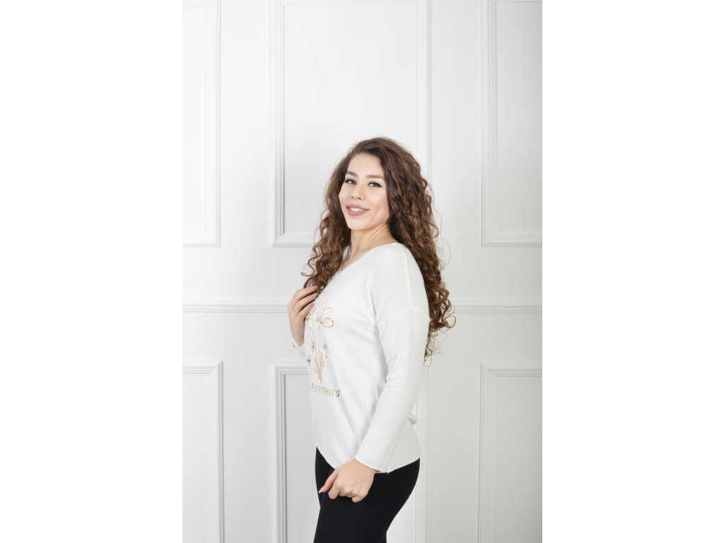 Elegantný dámsky pulóver v jemnom bielom odtieni, ktorý pôsobí nežne a žensky. Prednú časť zdobí decentná kvetinová potlač v zlatom metalickom prevedení s nápisom, ktorý dodáva kúsku romantický a pozitívny náboj. Mäkký a príjemný úplet zaručuje pohodlie počas celého dňa, zatiaľ čo jednoduchý strih umožňuje ľahké kombinovanie s džínsami, legínami či sukňou. Ideálny pulóver na bežné nosenie aj na chvíle, keď chceš vyzerať upravene bez námahy.