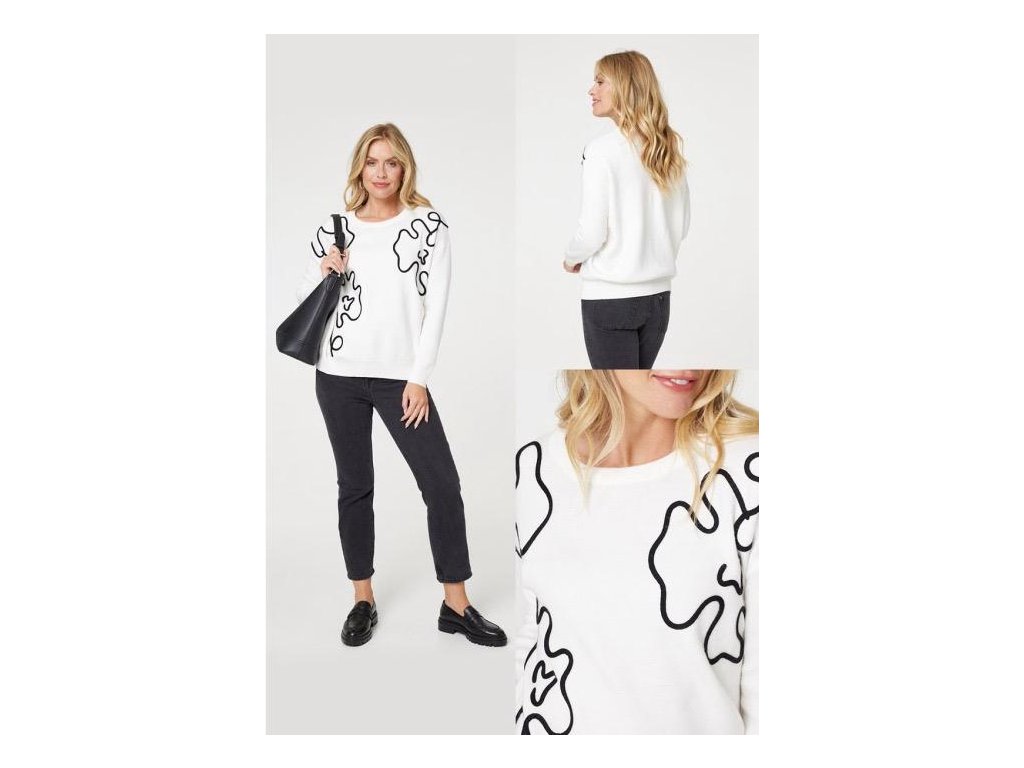 Dámsky dlhorukávový biely pulóver si zaujímavým čiernym vzorom a V výstrihom. Zaujímavý kúsok ktorý oživí Váš jesenný outfit.