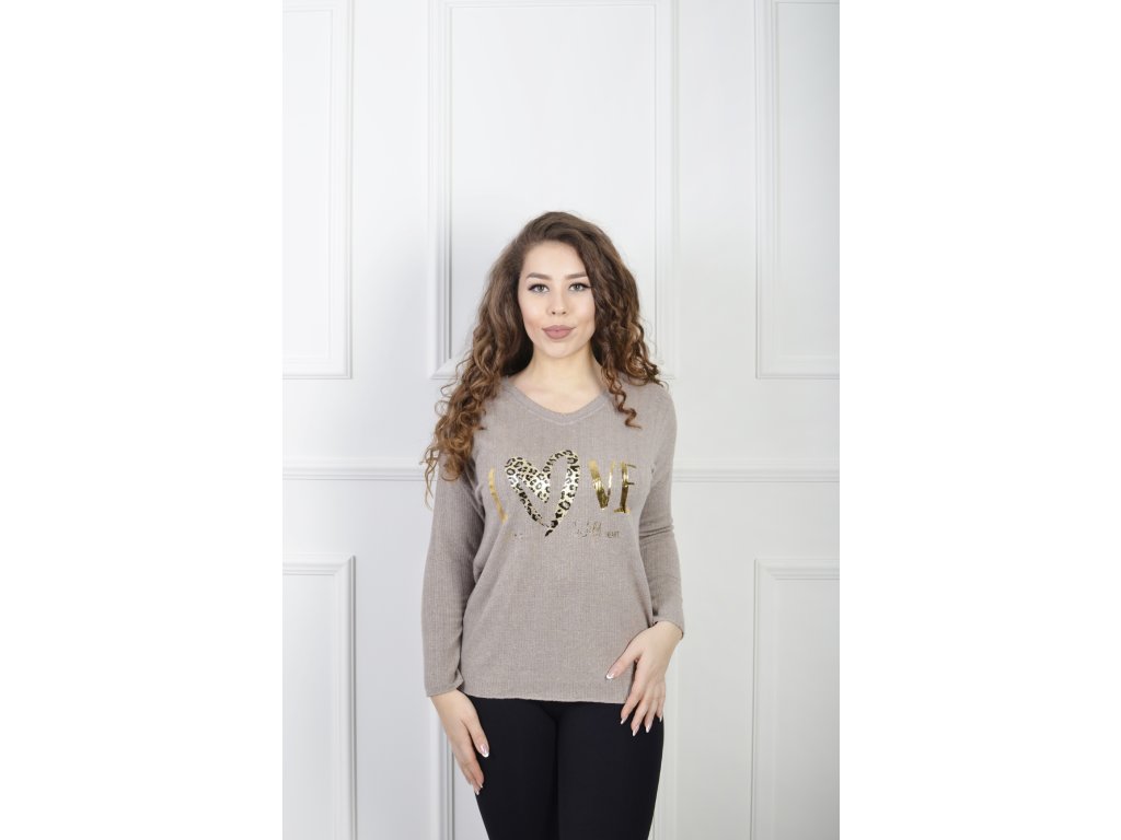 Jemný a pohodlný dámsky pulóver v neutrálnom béžovom odtieni, ktorý si zamiluješ na prvé oblečenie. Dominantná potlač LOVE so srdcom v leopardom a zlatom metalickom dizajne...