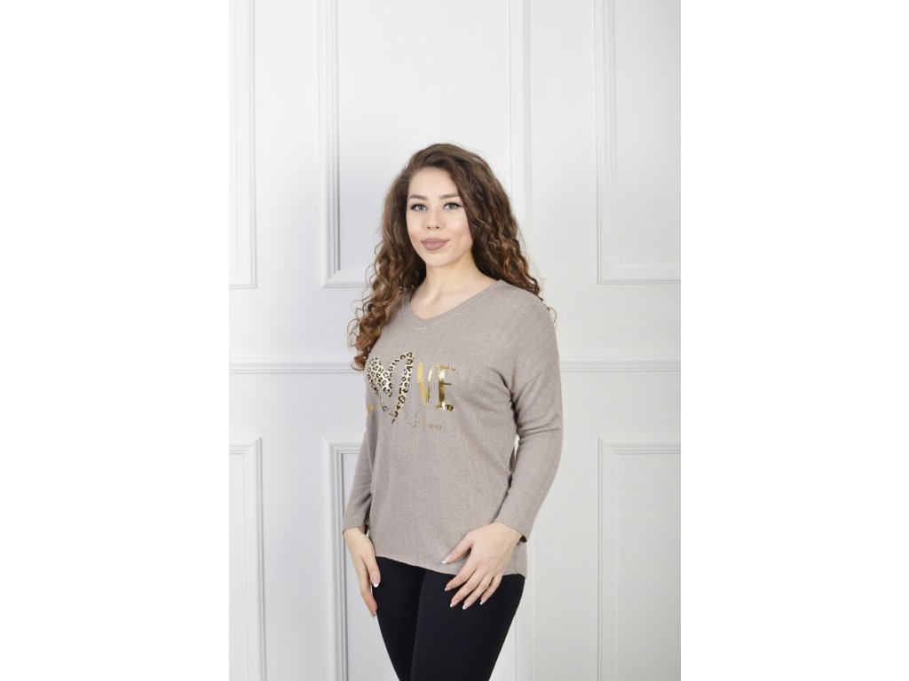 Dámsky bledohnedý pulóver s metalickým nápisom 23105