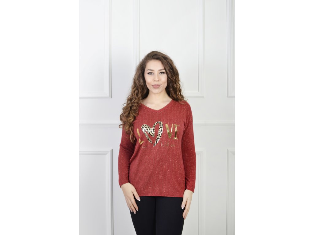 Dámsky červený pulóver s metalickým nápisom 23106