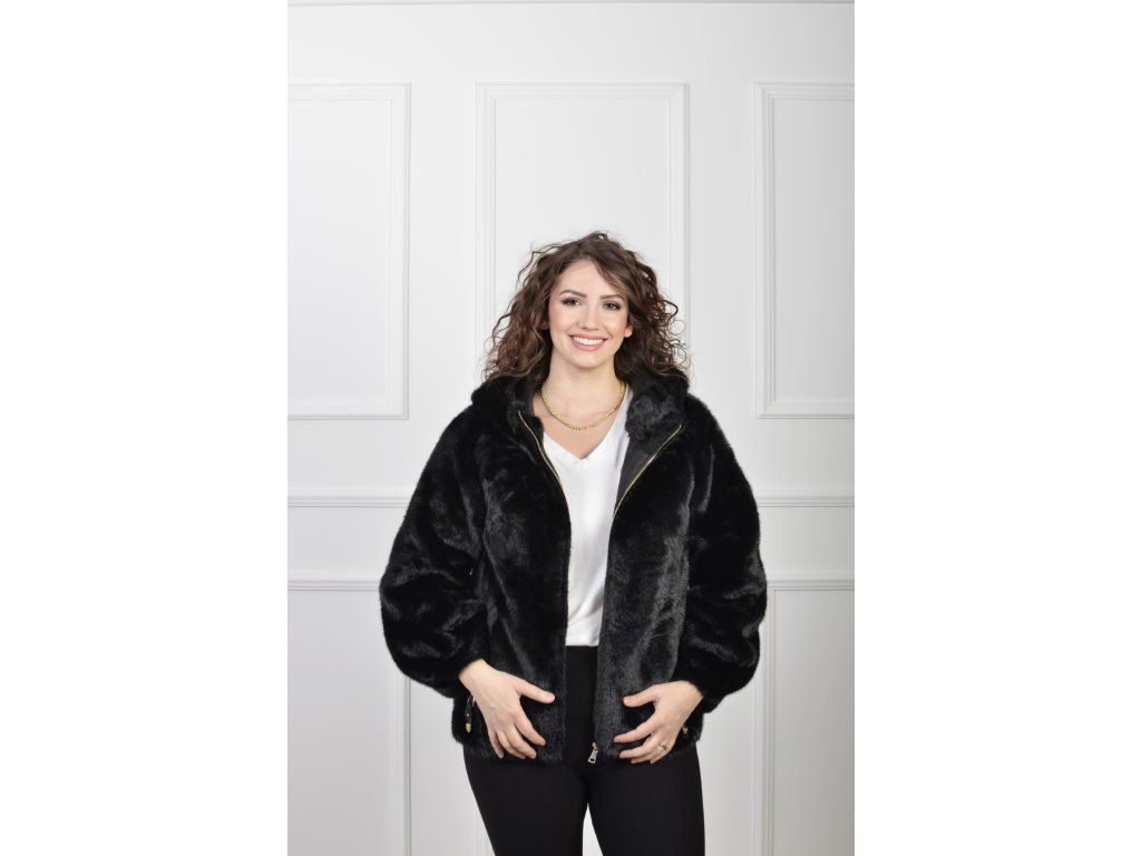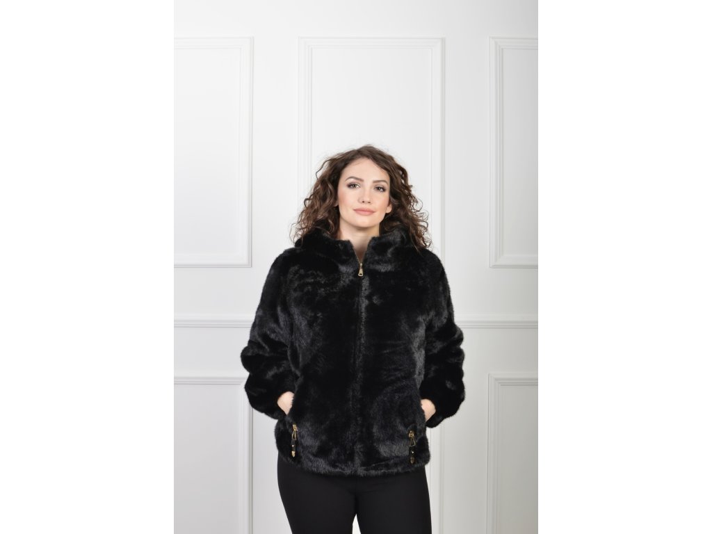 Dámsky hebký čierny kožušinový kabát s kapucňou 22912