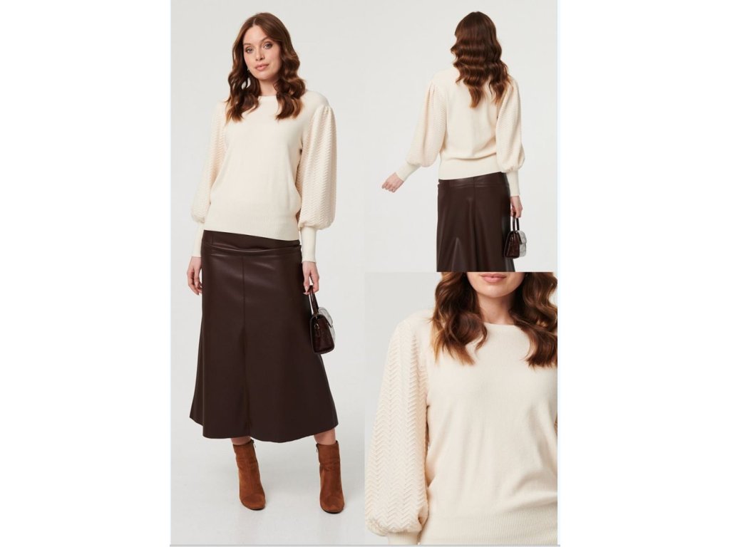 Dámsky krémový pulóver s balónovými rukávmi a jemným vzorom 22744