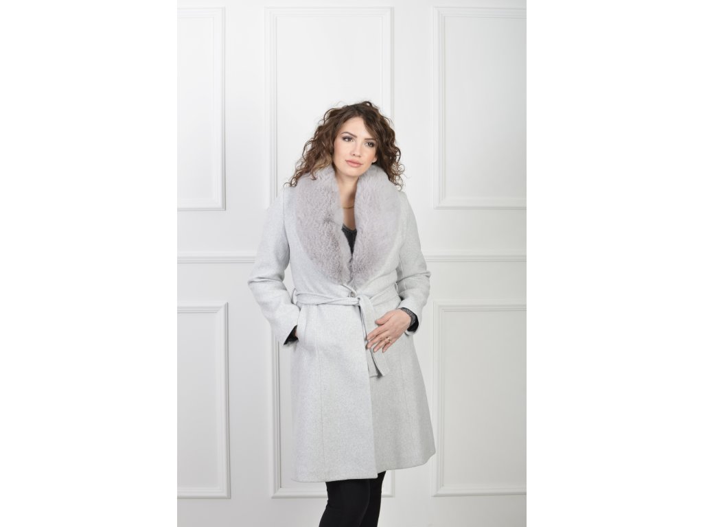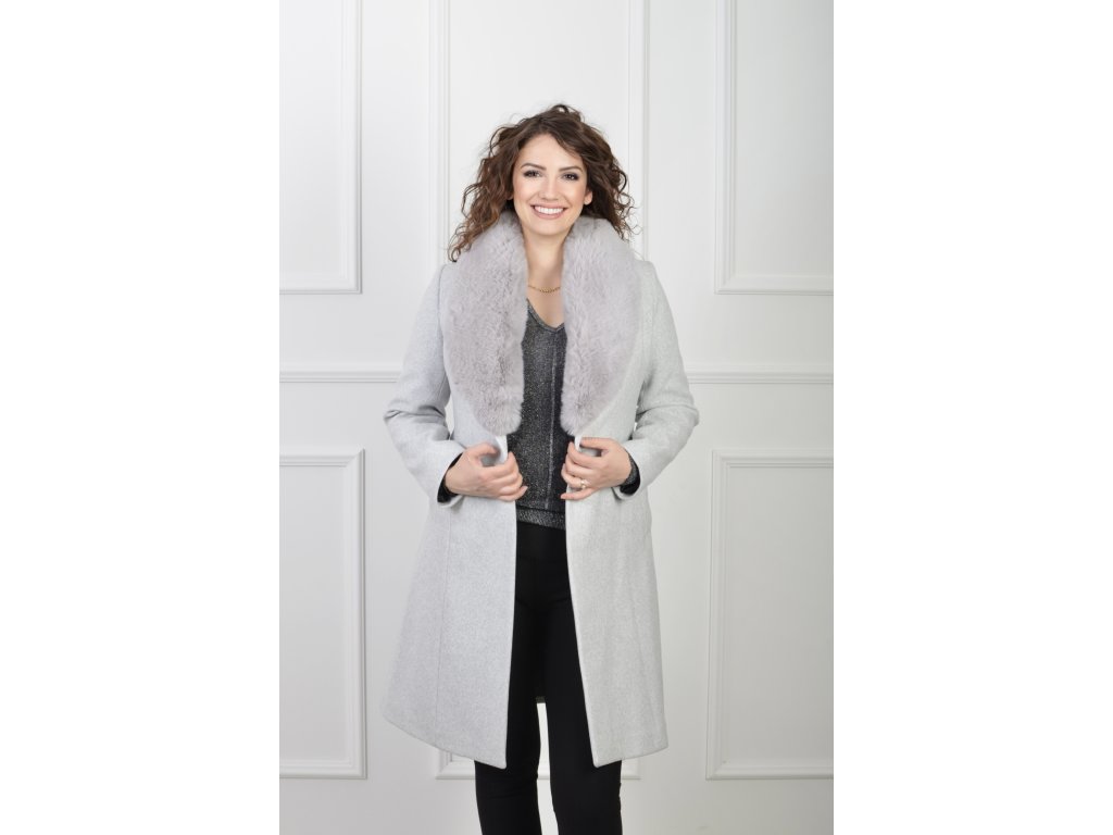 Dámsky sivý kabát s odnímateľným kožušinovým golierom 23050
