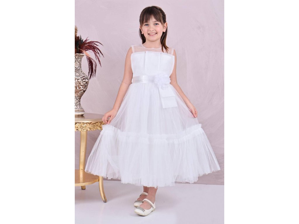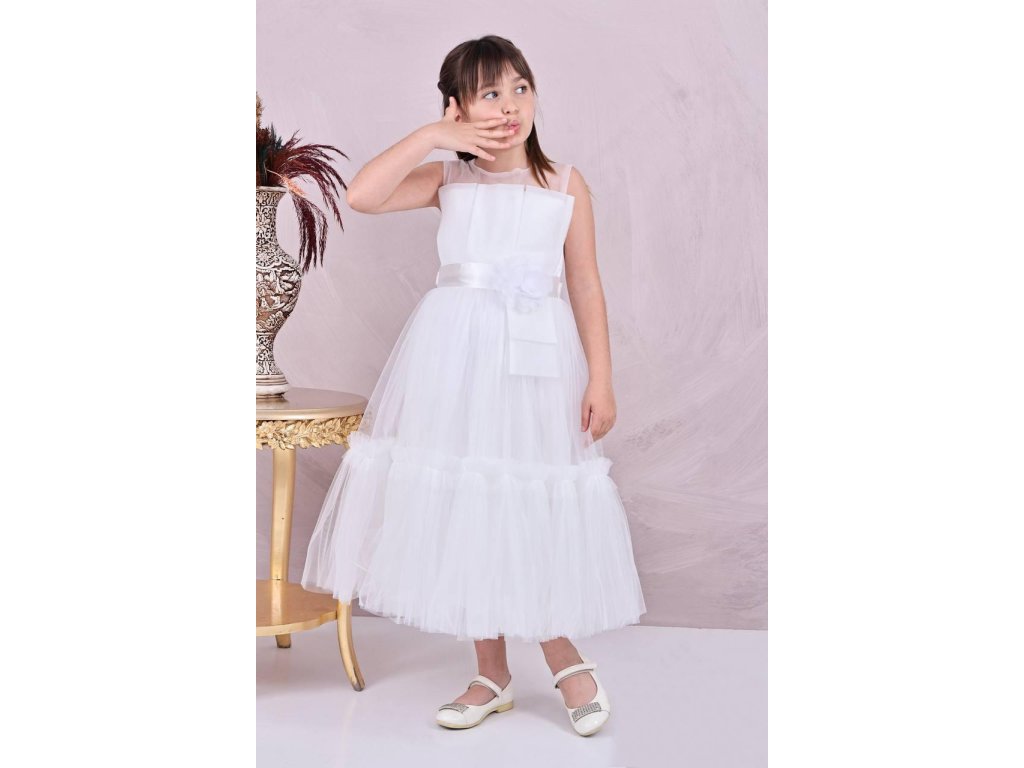 Dievčenské biele šaty s ozdobným kvetom v páse 21826