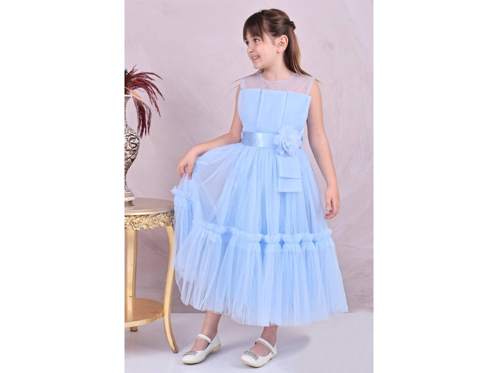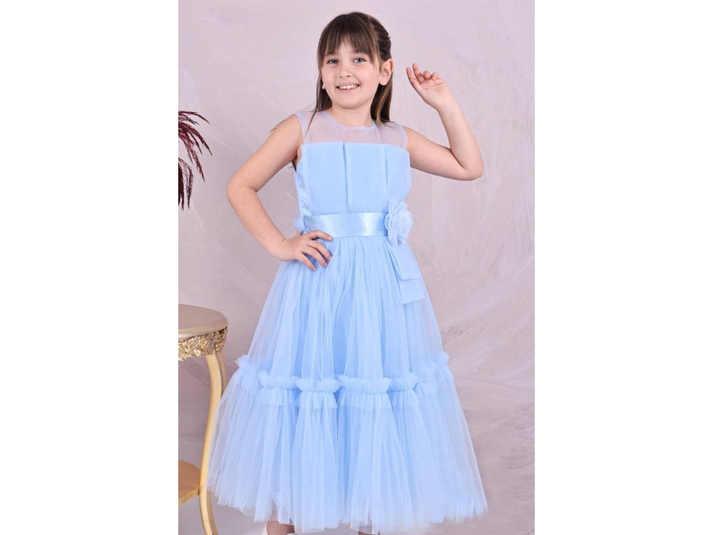 Dievčenské modré šaty s ozdobným kvetom v páse 21825