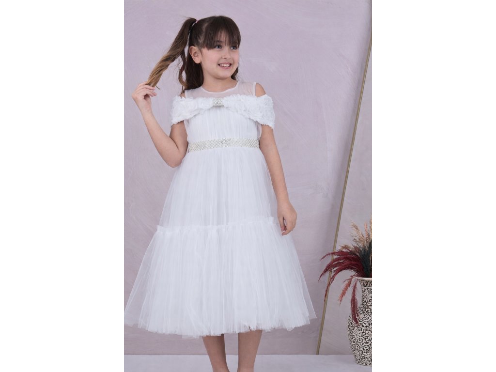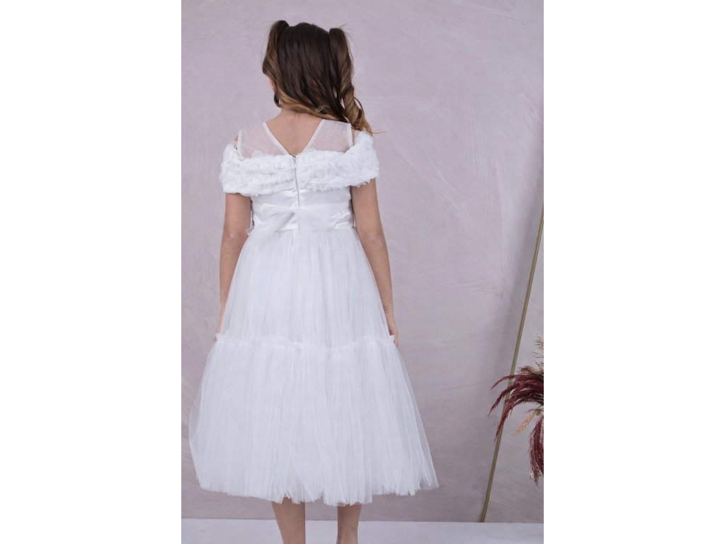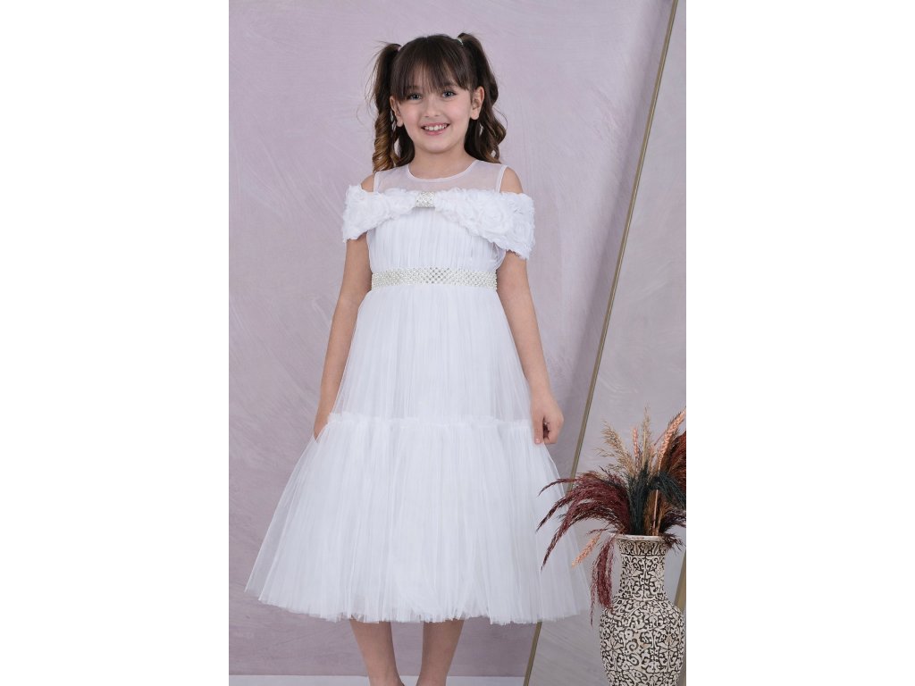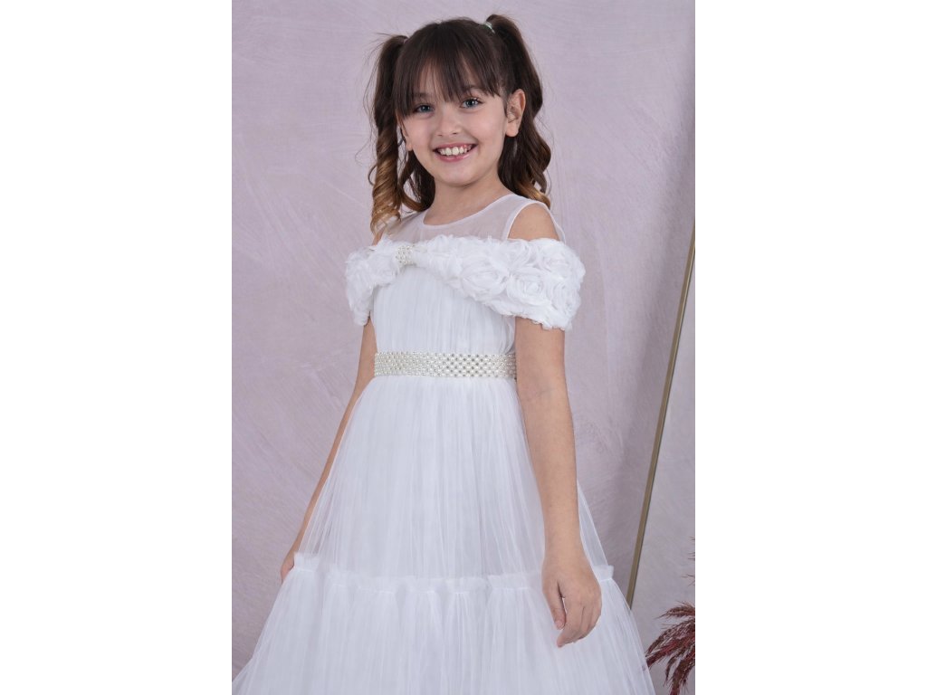 Dievčenské slávnostné biele šaty s tylovou sukňou a kvetmi 23176