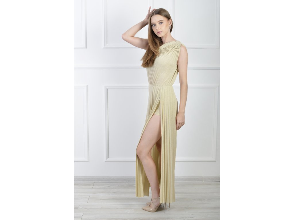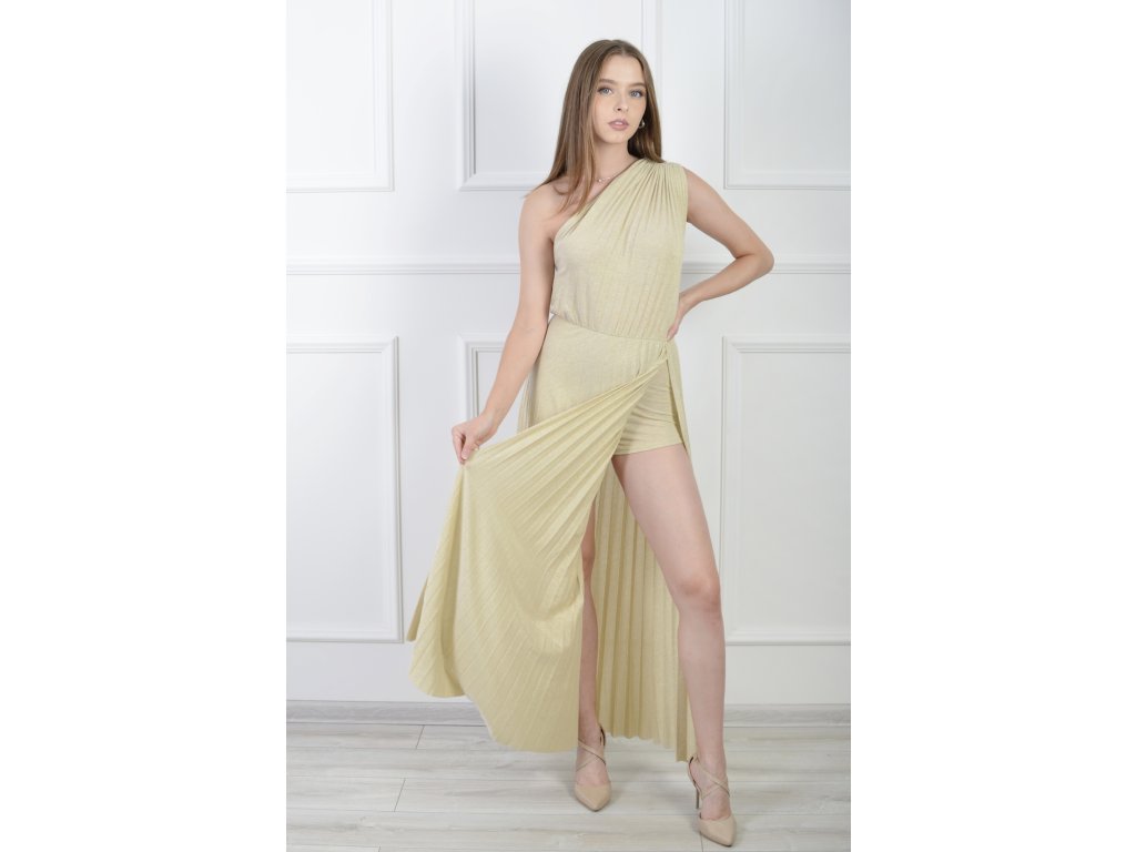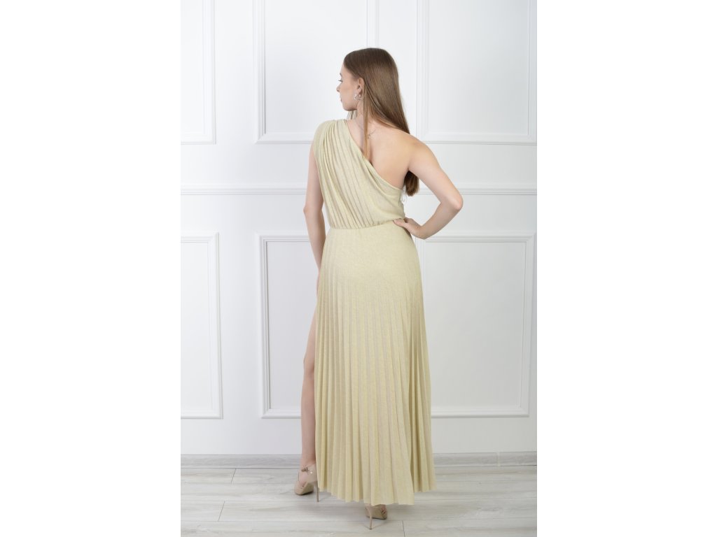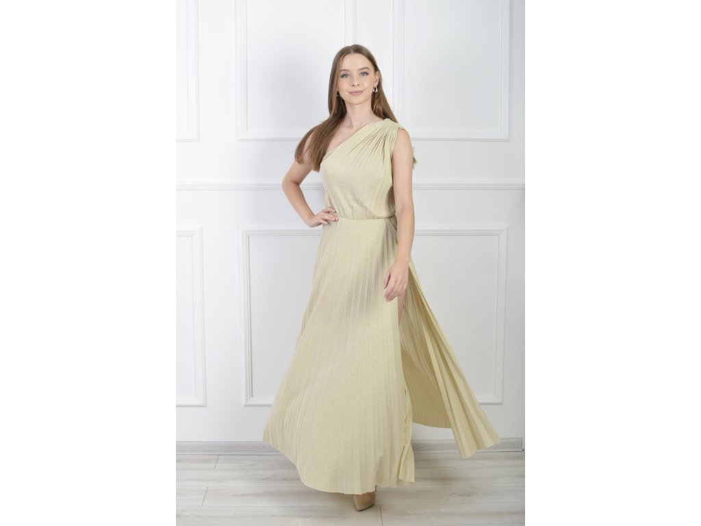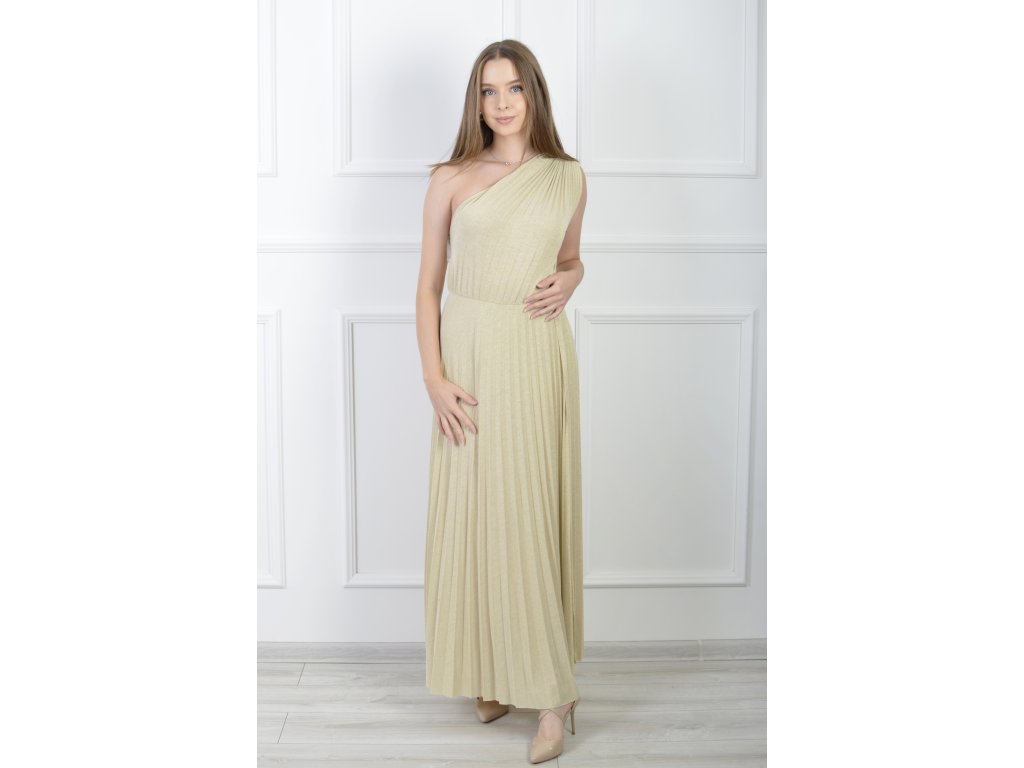Dlhé béžové dámske šaty so zlatým leskom na jedno rameno 21942