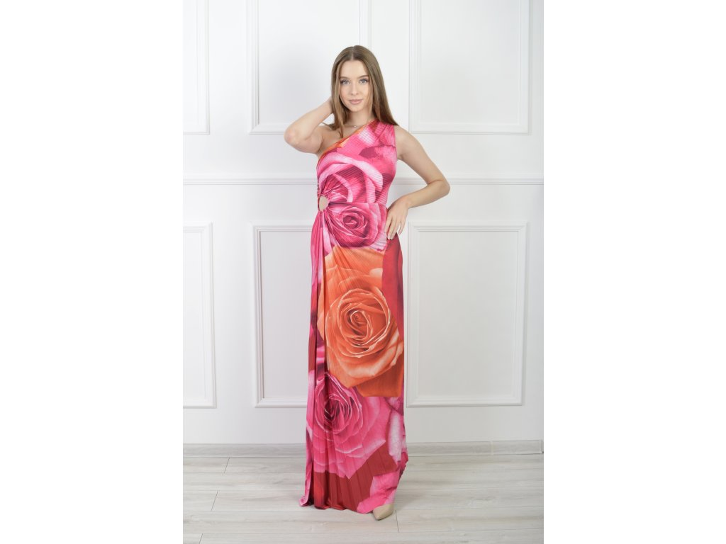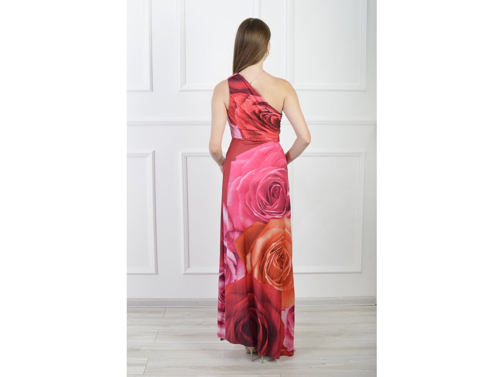 Dlhé cyklámenovo-oranžové kvetované dámske šaty na jedno rameno 22060