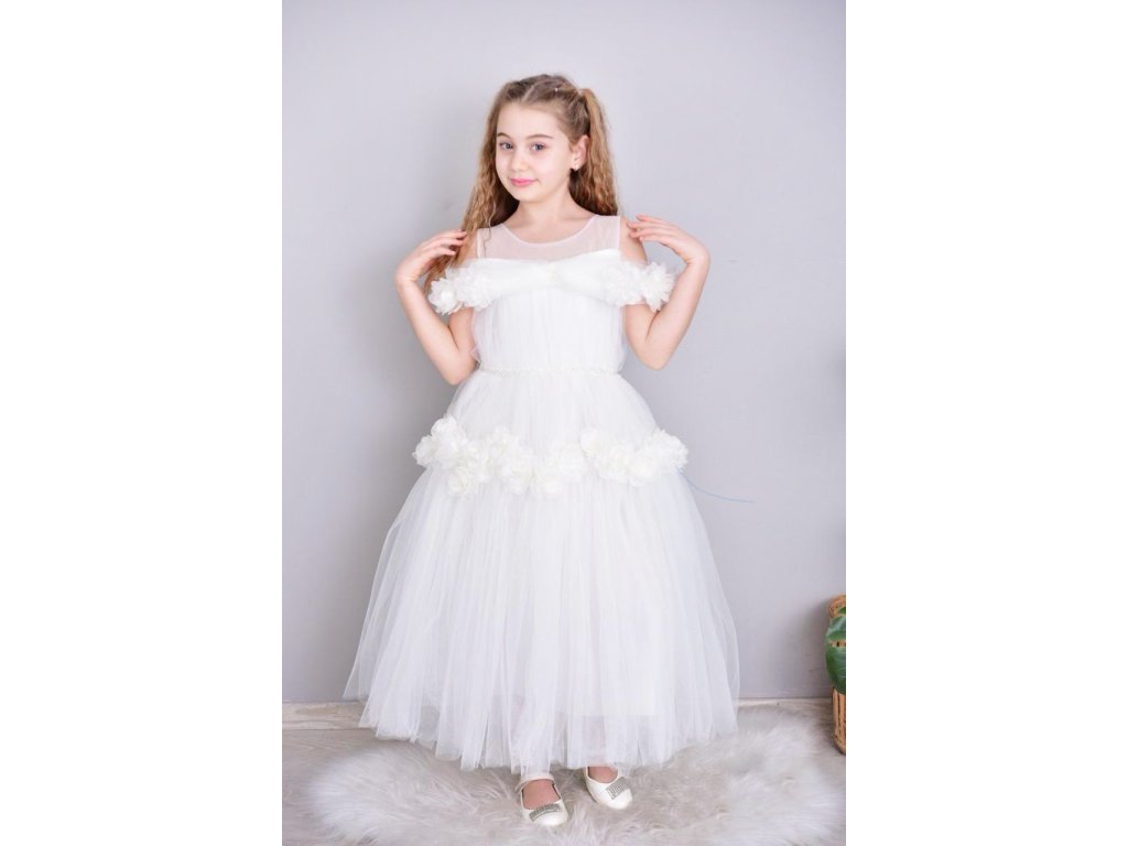 Dlhé biele dievčenské spoločenské šaty. Kvetinové zdobenie na ramenách a na sukňovej časti. slečny družičky alebo na sväté prijímanie.