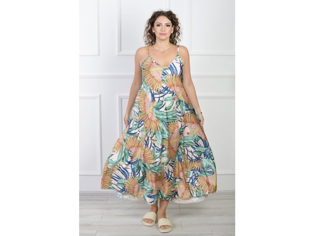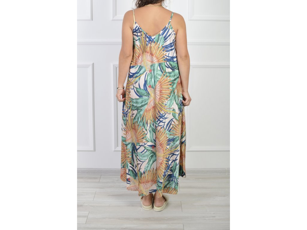Dlhé farebné šaty so vzorom modro-zelených papagájov 22114