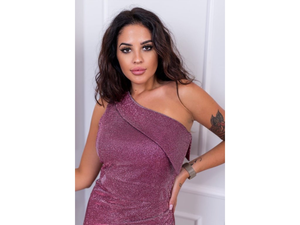 Dlhé fialové lesklé spoločenské šaty na jedno rameno s rozparkom 19613