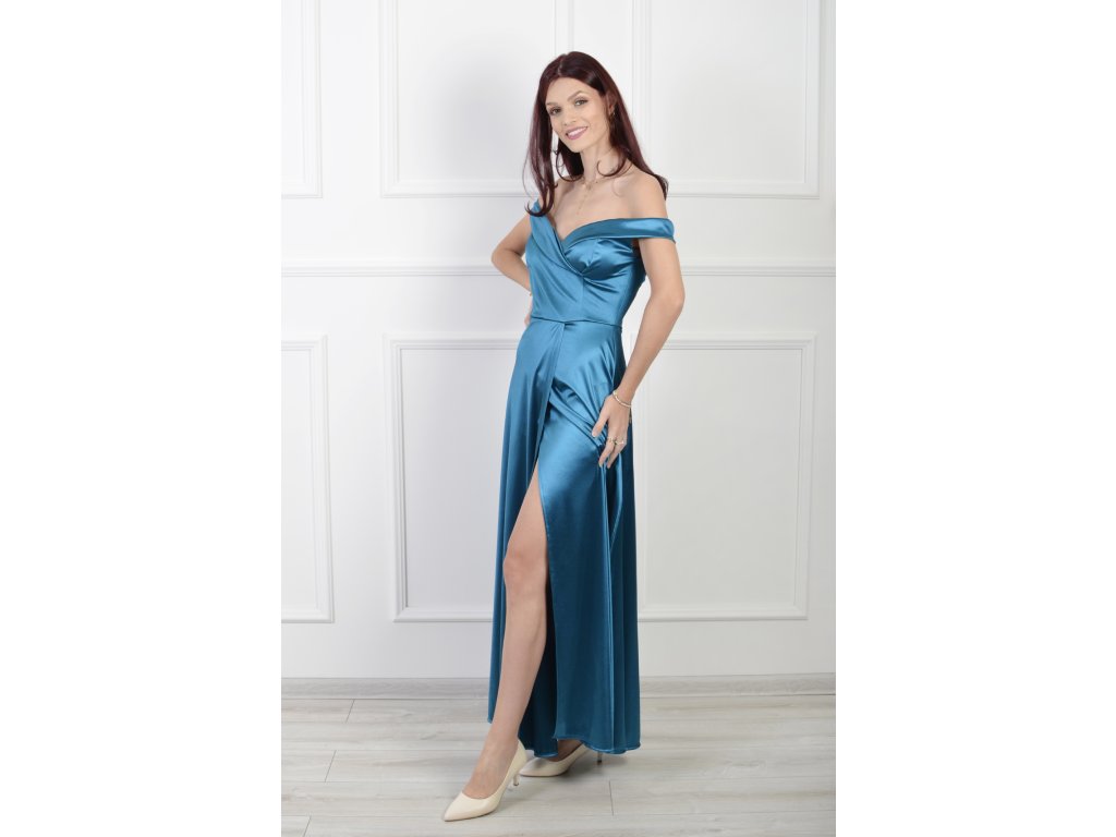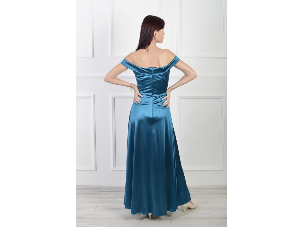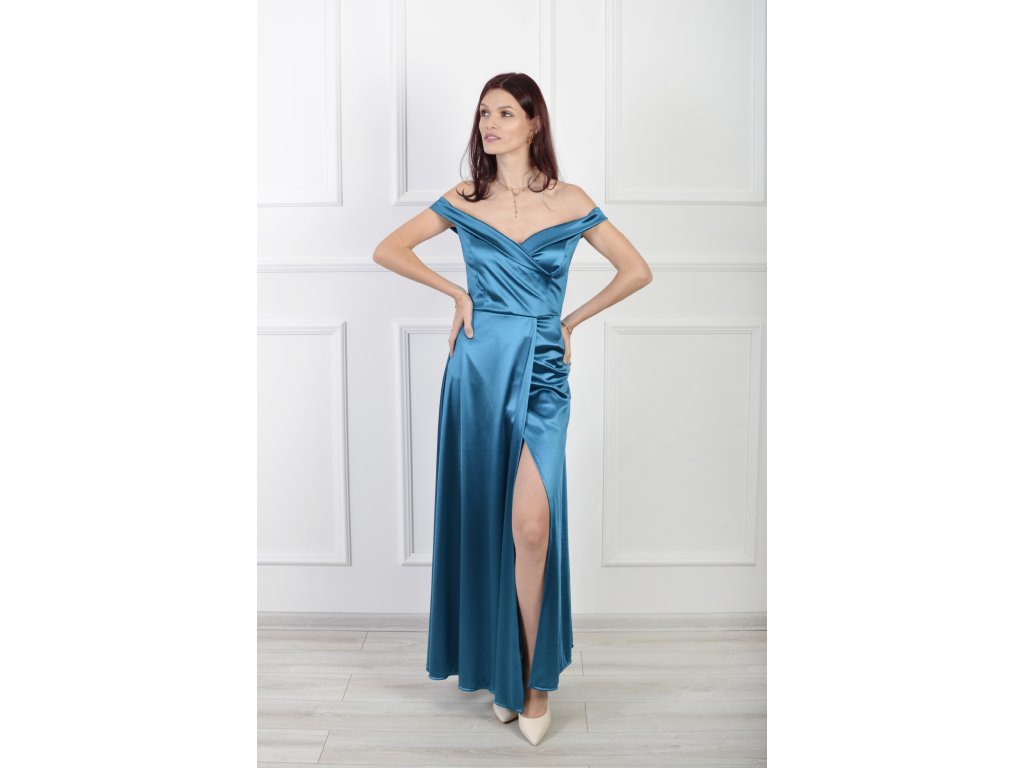 Dlhé dámske hladké šaty smaragdovej farby s odhalenými ramenami a rozparkom. Šaty majú zapínanie na zips na zadnej strane. Štýlový ale elegantný kúsok či už na stužkovú , svadbu alebo inú spoločenskú udalosť.