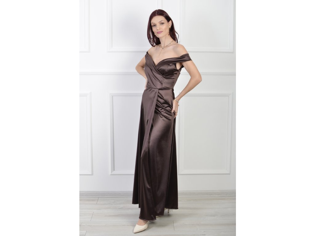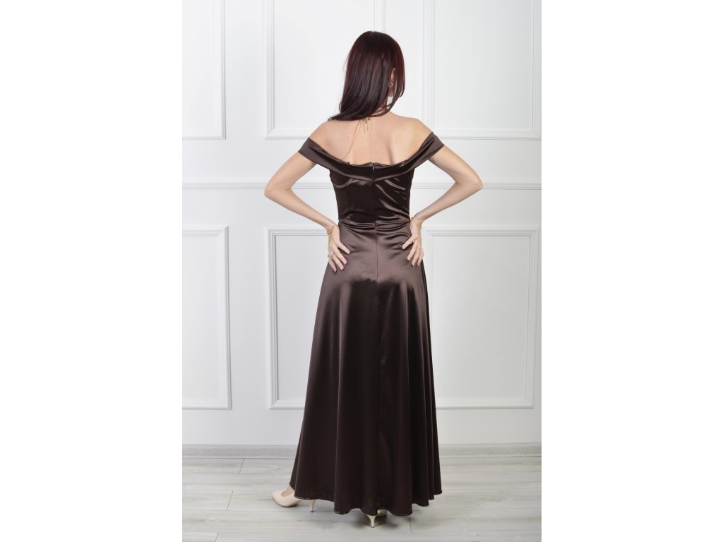 Dlhé dámske hladké šaty tmavohnedej farby s odhalenými ramenami a rozparkom. Šaty majú zapínanie na zips na zadnej strane. Štýlový ale elegantný kúsok či už na stužkovú , svadbu alebo inú spoločenskú udalosť.