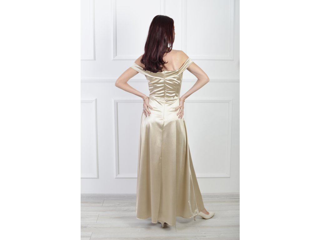 Dlhé dámske hladké šaty zlatej farby s odhalenými ramenami a rozparkom. Šaty majú zapínanie na zips na zadnej strane. Štýlový ale elegantný kúsok či už na stužkovú , svadbu alebo inú spoločenskú udalosť.