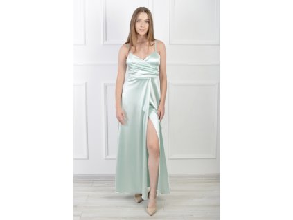 Dlhé hladké šaty mentolovej farby s rozparkom . Šaty sú na ramienka a zapínajú sa na zips na zadnej strane.