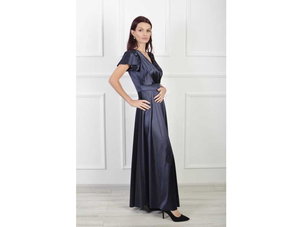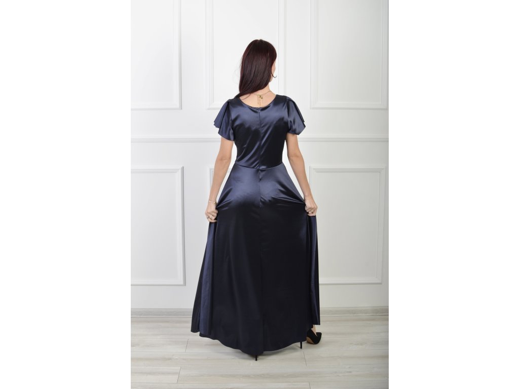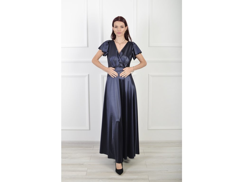 Dlhé hladké spoločenské šaty tmavomodrej farby s volánovými rukávmi 22340