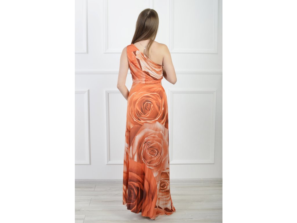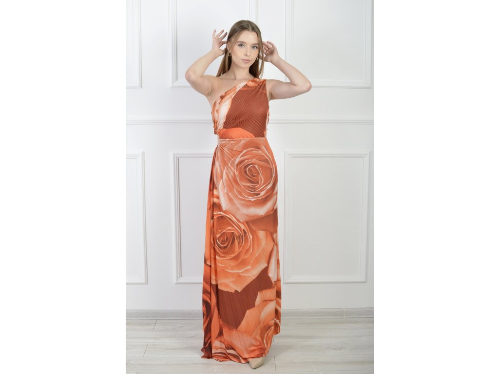 Dlhé oranžovo-hnedé kvetované dámske šaty na jedno rameno 22061