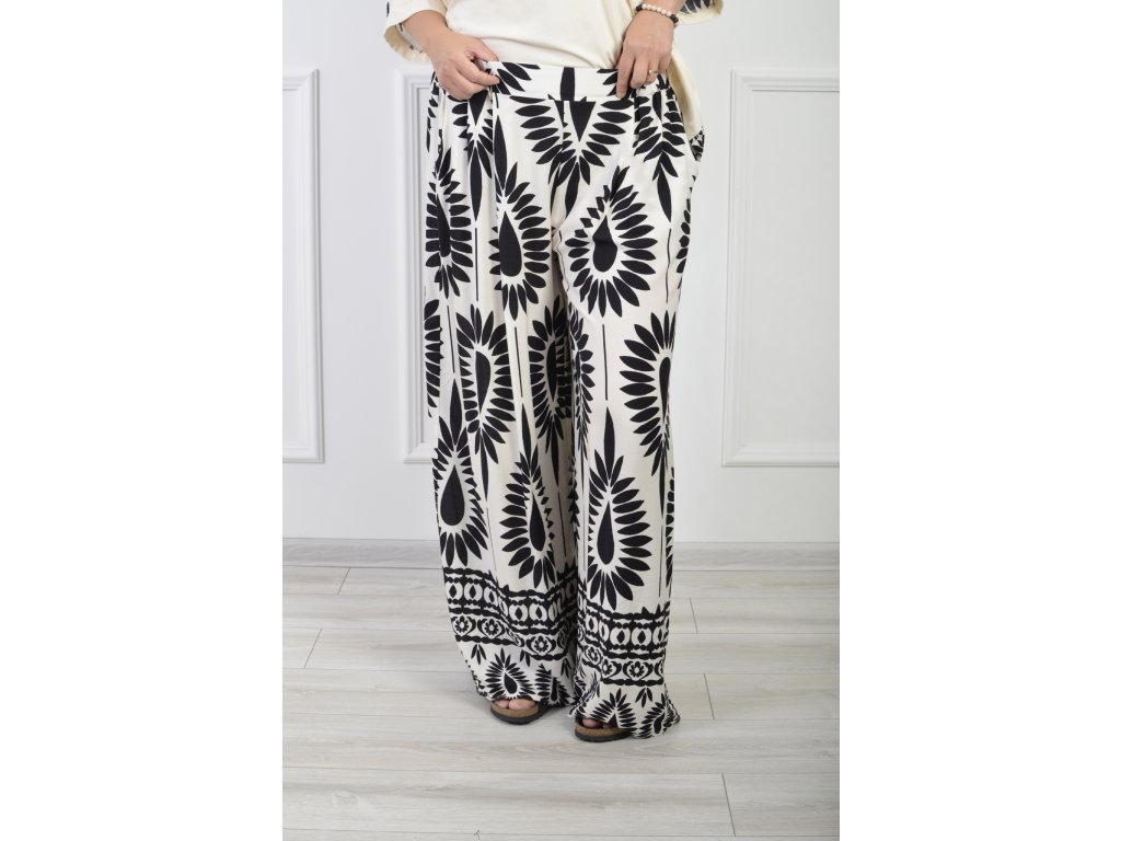 Dlhé široké nohavice krémovej farby s čiernym vzorom 21966