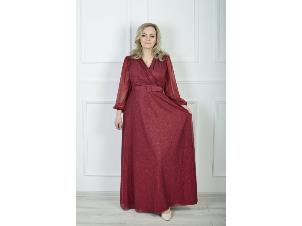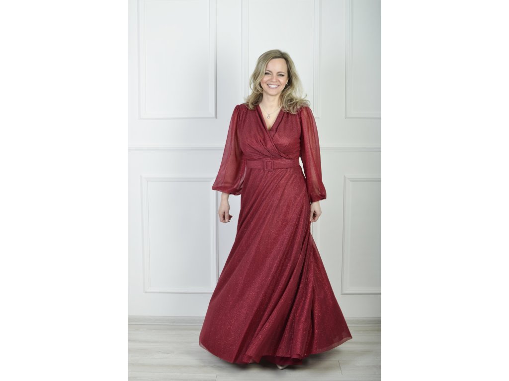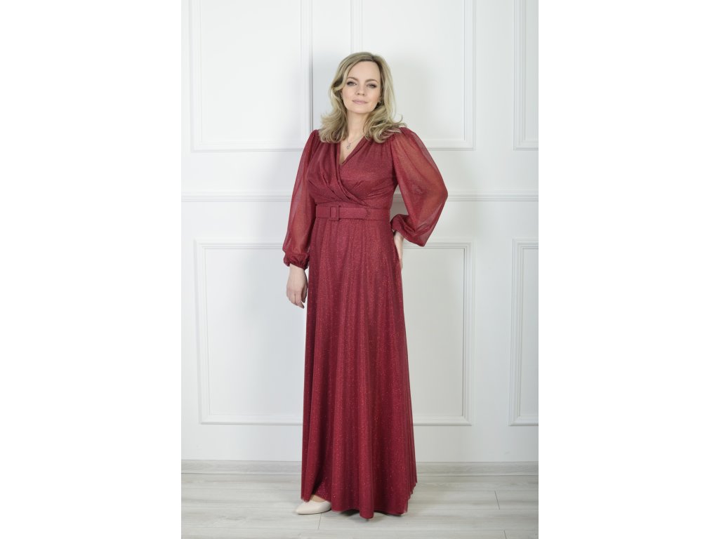 Dlhé spoločenské bordové šaty s trblietavým efektom a šifónovými rukávmi 22720