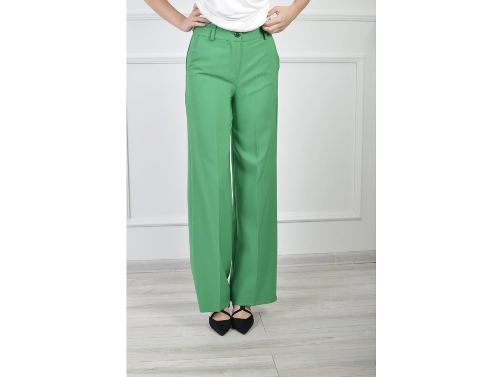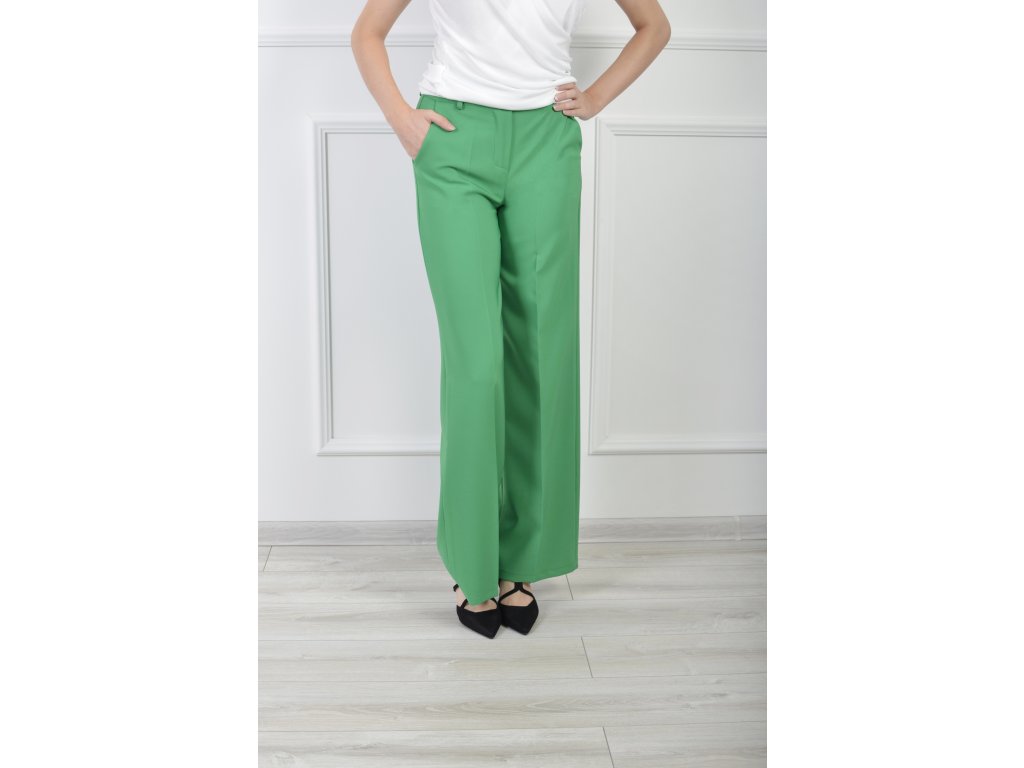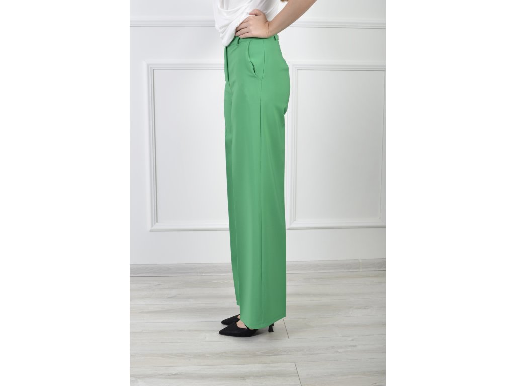 Dámske dlhé kostýmové nohavice zelenej farby s vreckami , pútkami a zapínaním na gombík.