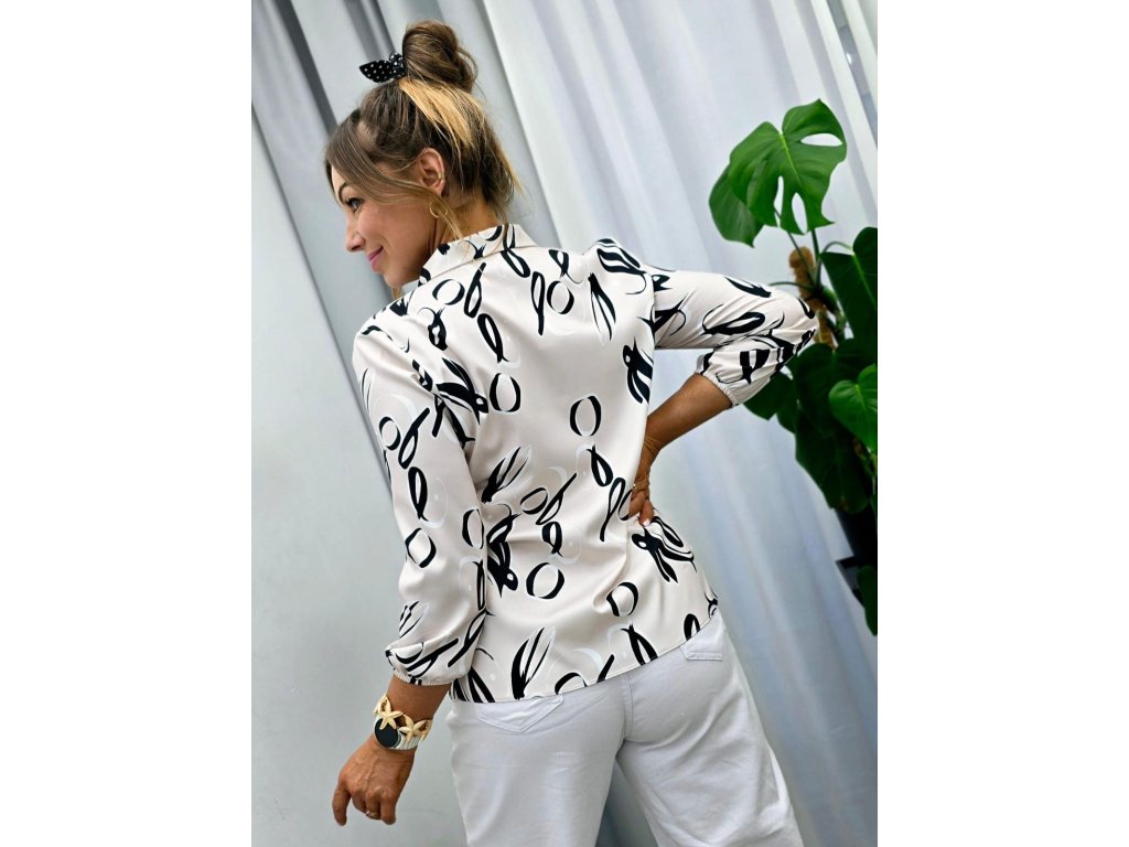 Táto štýlová blúzka v jemnom béžovom odtieni zaujme moderným grafickým vzorom v kontrastnej čiernej farbe. Viazanie pri krku dodáva blúzke ženský a sofistikovaný vzhľad, vďaka čomu je ideálnou voľbou do práce aj na neformálne stretnutia. Príjemný, ľahký materiál zabezpečuje pohodlie počas celého dňa a voľnejší strih lichotí postave. Blúzka sa skvele kombinuje s nohavicami, sukňou aj džínsami a ľahko vytvorí elegantný aj casual outfit.