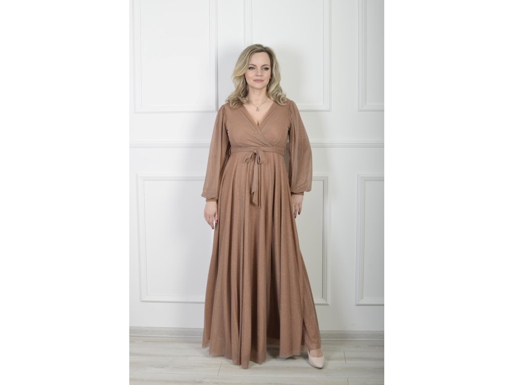 Elegantné hnedé dlhé trblietavé šaty s prekladaným výstrihom 22660