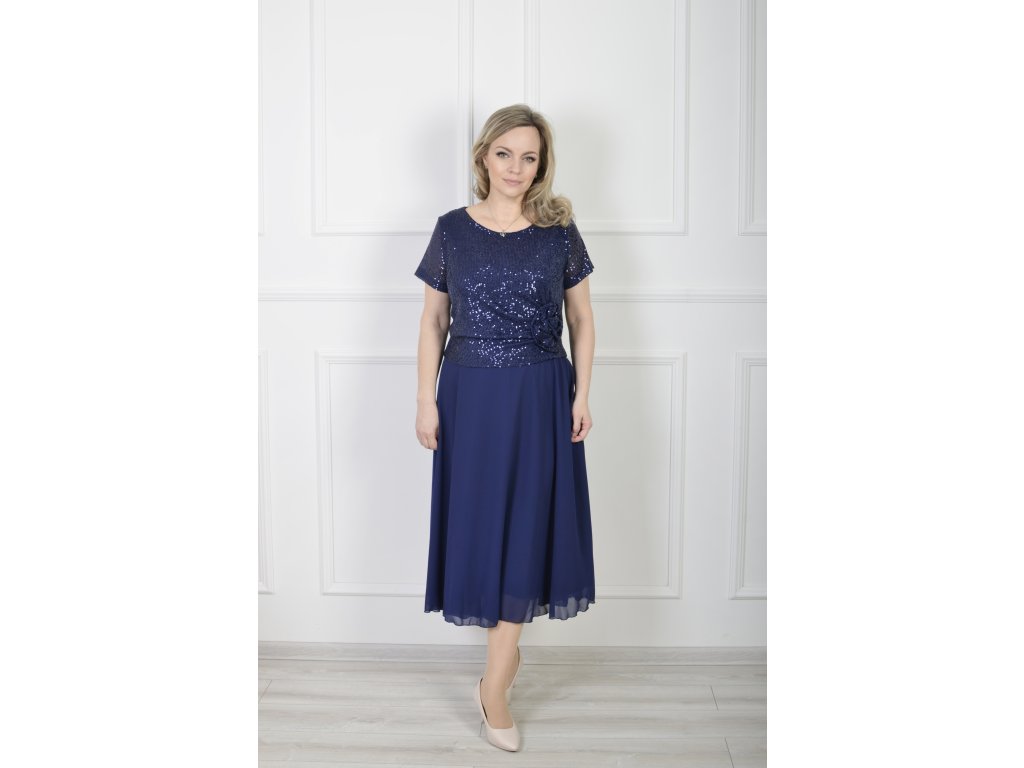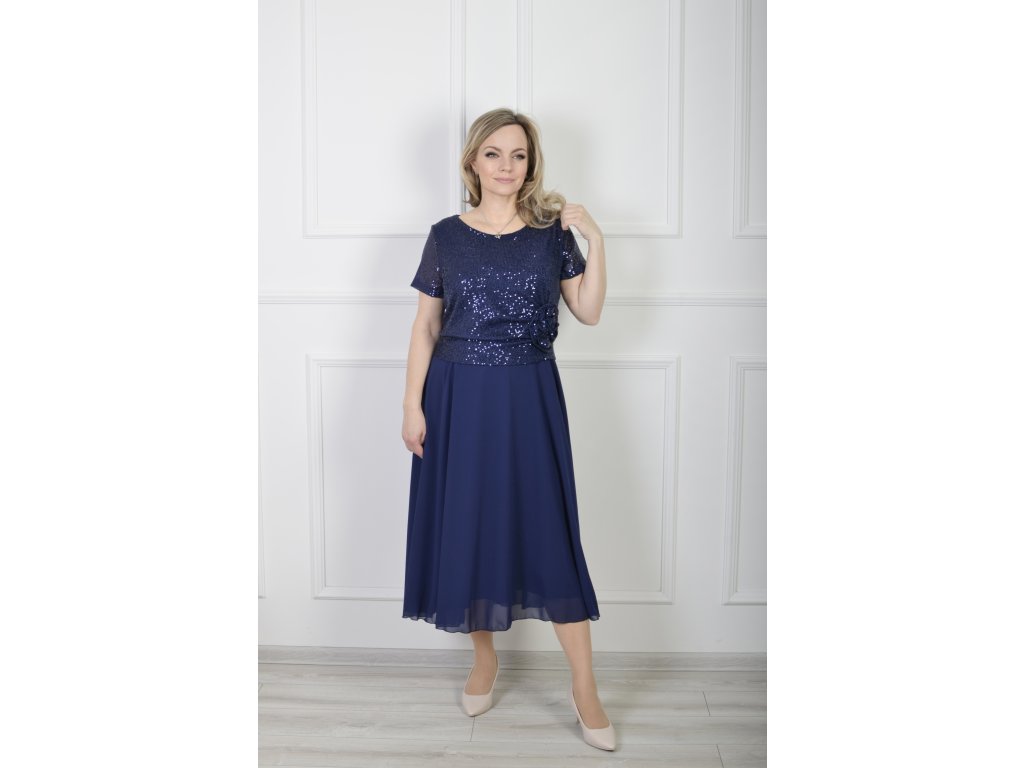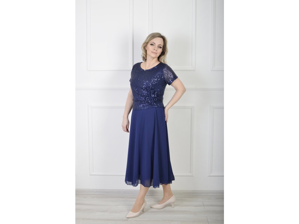 Elegantné spoločenské midi tmavomodré šaty s flitrovaným topom 22894
