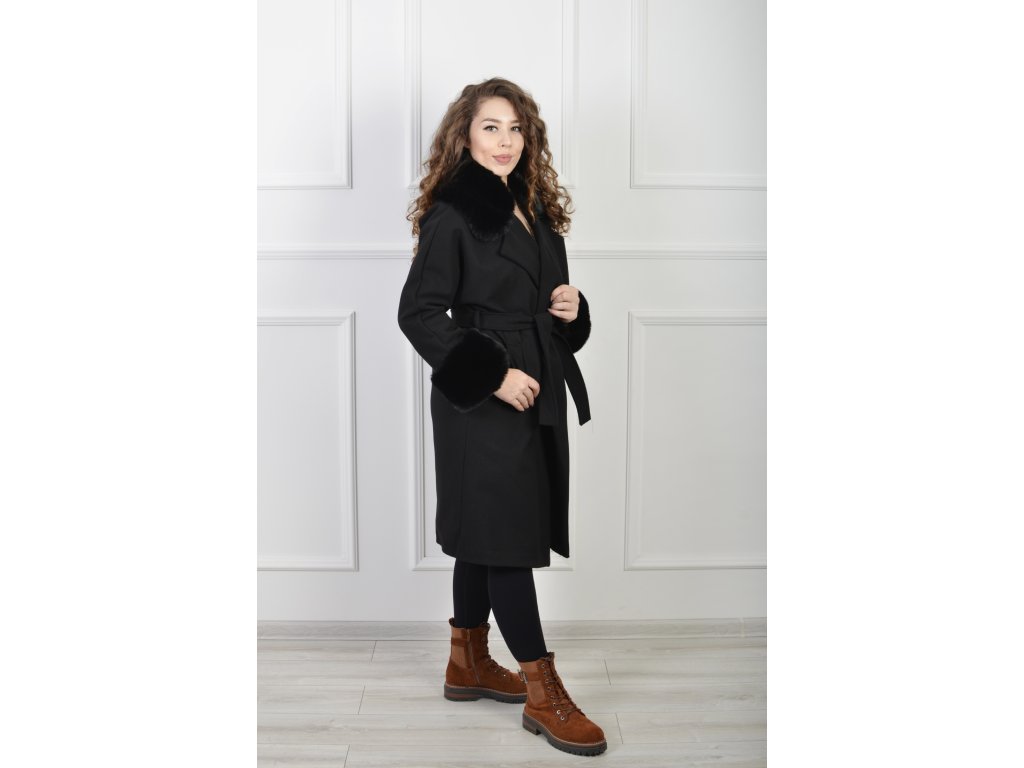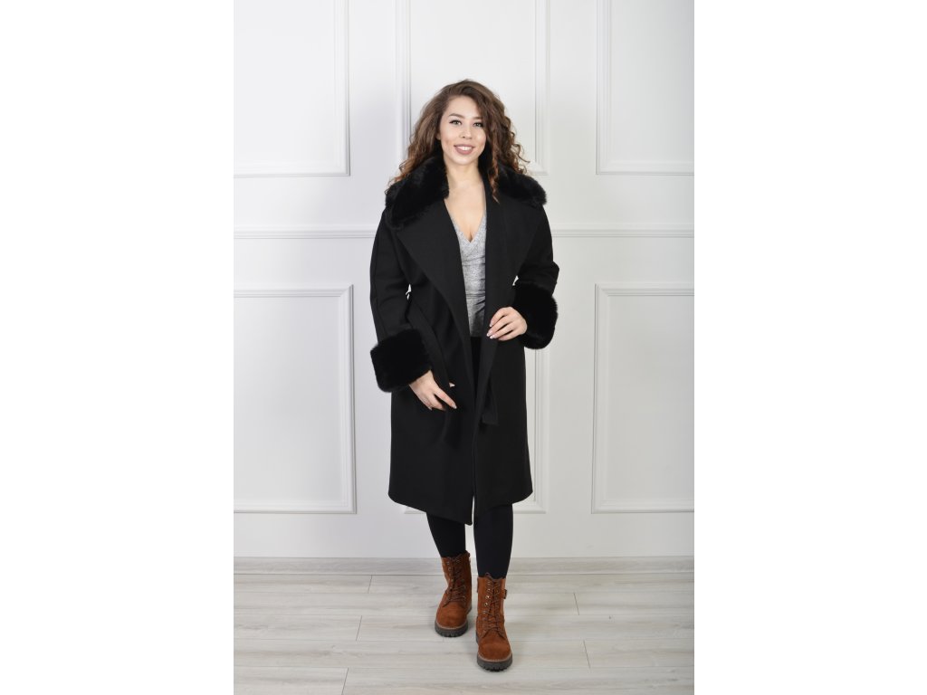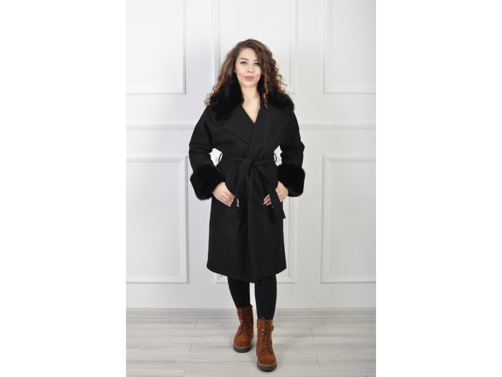 Elegantný čierny kabát s kožušinovým golierom 23051