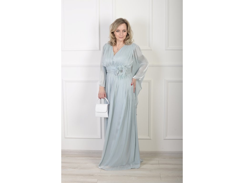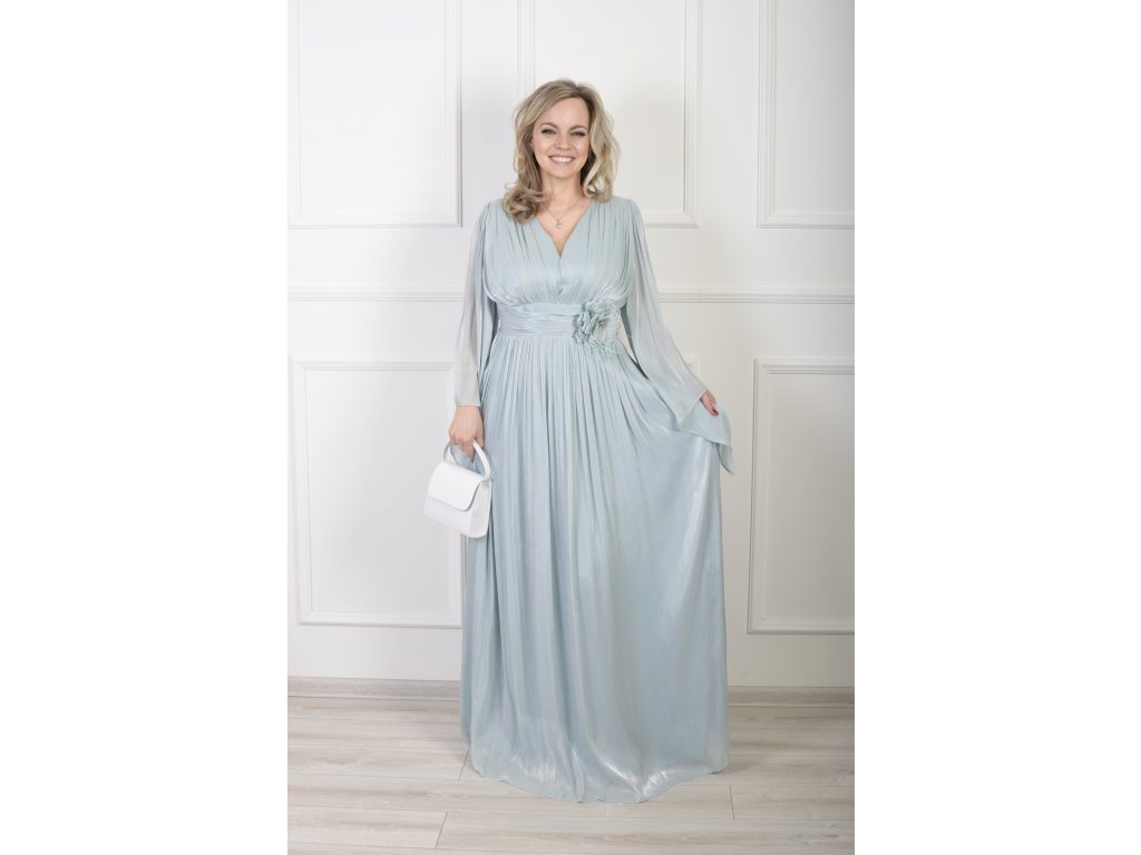 Výrazne elegantné dámske šaty v jemnej bledomodrej farbe, ktoré očaria svojou ľahkosťou a romantickým vzhľadom. Prekladaný V-výstrih krásne zvýrazňuje dekolt, zatiaľ čo vysoký pás opticky predlžuje postavu a lichotí siluete. Splývavý, jemne priesvitný materiál dodáva šatám vzdušnosť a pôsobivý pohyb pri chôdzi. Dominantným detailom je dekoratívny kvet v páse, ktorý podčiarkuje ženskosť a výnimočnosť modelu. Dlhé, voľne splývajúce rukávy dodávajú šatám noblesu a jemný dramatický efekt. Ideálna voľba na svadby, slávnostné príležitosti, večerné udalosti či výnimočné oslavy, kde chcete pôsobiť elegantne a nezabudnuteľne.