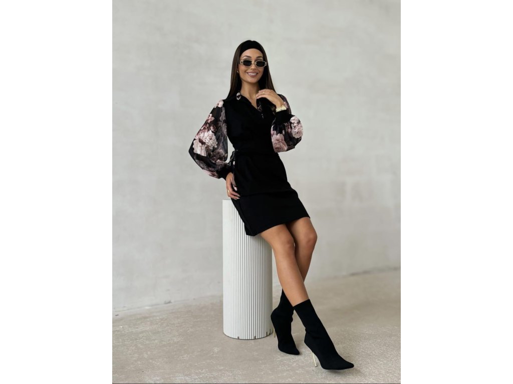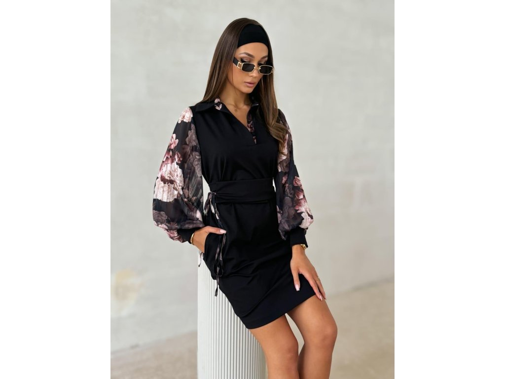 Dámske krátke šaty čiernej farby s dlhými kvetovanými šifónovými rukávmi , V výstrihom a viazaním v páse.