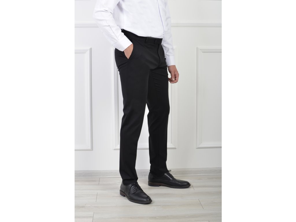 Pánske hladké oblekové nohavice čiernej farby. Nohavice majú vrecká, pútka na opasok a zapínanie na zips a gombík. Pár ku kódu 22216.