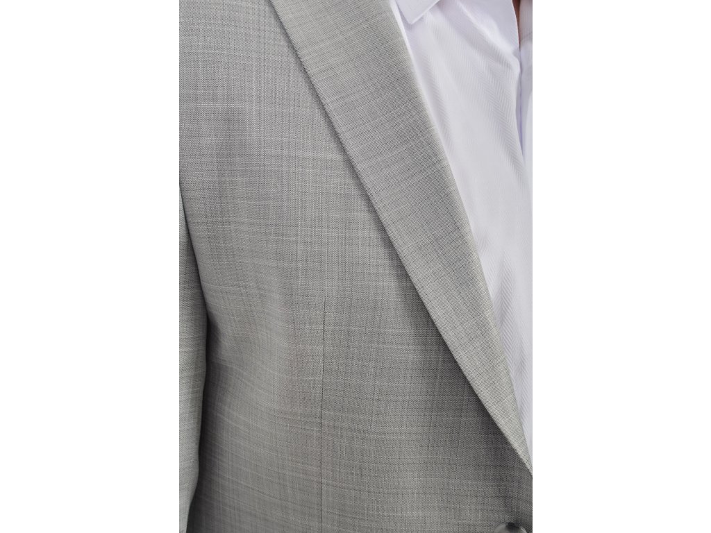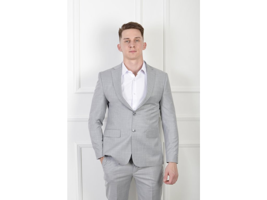 Pánske oblekové sako bledosivej farby s jemným vzorom. Sako má vrecká, rozparky na zadnej strane a zapínanie na dva gombíky. Pár ku kódu 21513.