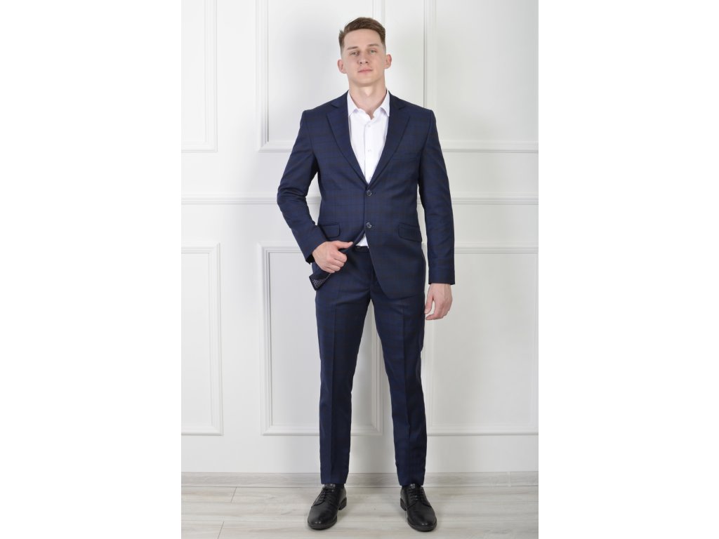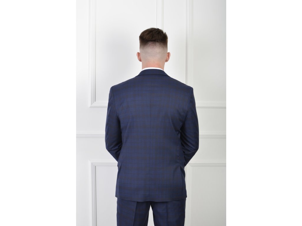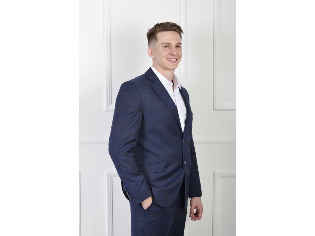Pánske oblekové sako tmavomodrej farby so vzorom hnedých kociek 21411