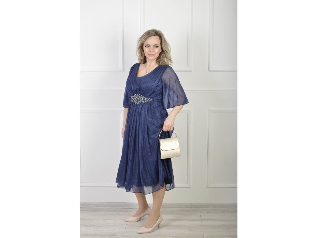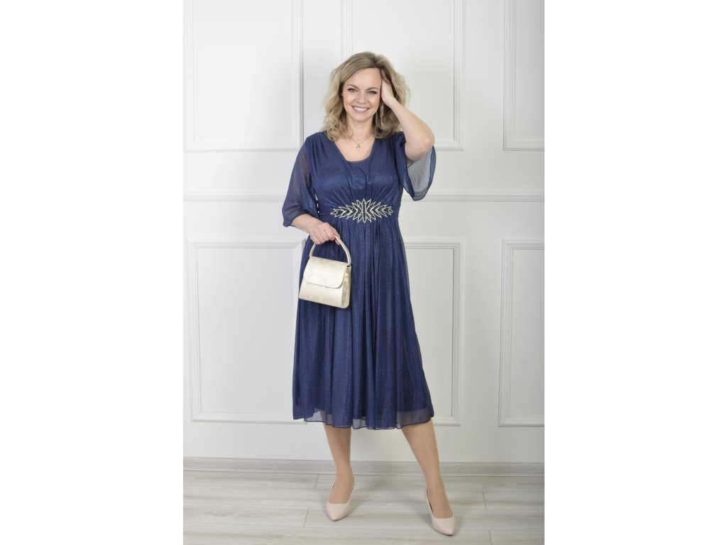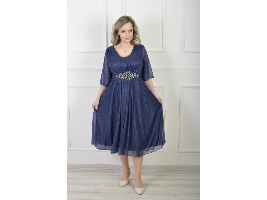 Tmavomodré midi spoločenské šaty s jemným trblietaním a zdobeným pásom 22605